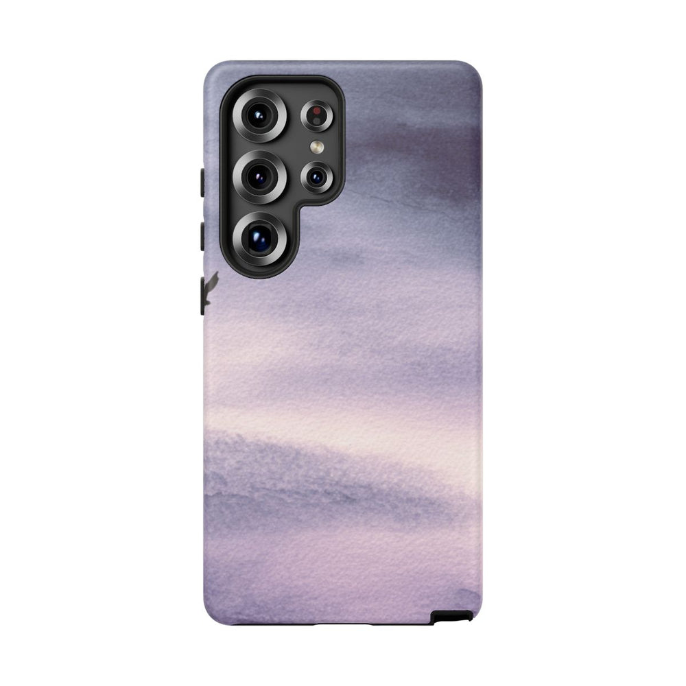 Dit ontwerp toont een eenzame vogel die vliegt tegen een getextureerde lucht in paarse en grijze tinten. De lucht heeft een aquareleffect met zachte kleurverlopen en gelaagde wolken, wat zorgt voor een rustige en minimalistische uitstraling. De afbeelding is bedrukt op een mat hoesje van polycarbonaat met een TPU-voering en biedt dubbele bescherming. Het hoesje ondersteunt draadloos opladen en is bestand tegen weersinvloeden, waardoor de optische kwaliteit langdurig behouden blijft.