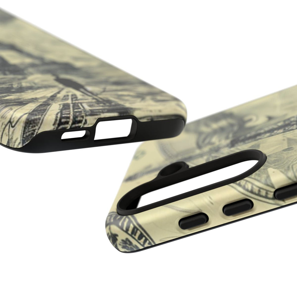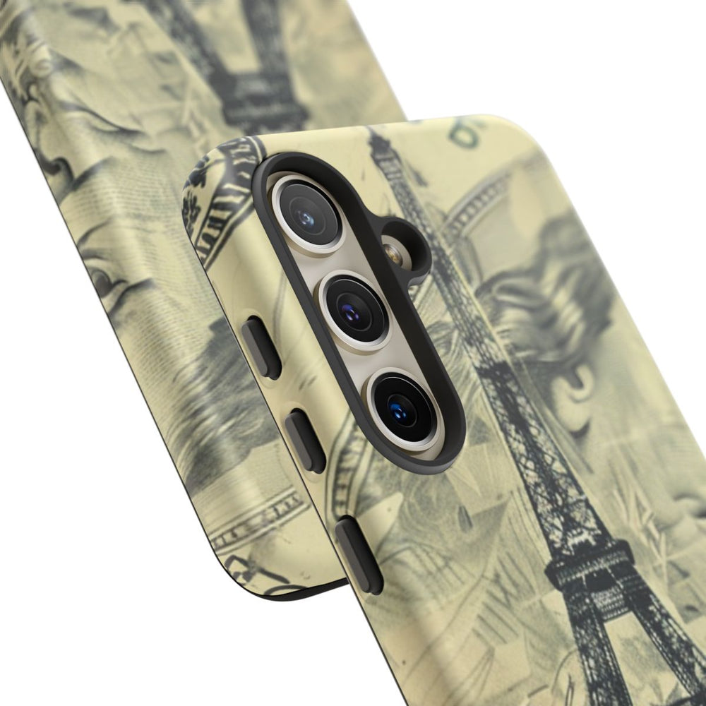 Dit hoesje is voorzien van een gedetailleerde zwart-wit illustratie van de Eiffeltoren die opvallend staat afgebeeld op een groot dollarbiljet. Zowel de achtergrond als de voorgrond zijn rijkelijk ingevuld met fijne schetsen van geldmotieven en handgeschreven teksten, wat zorgt voor een surrealistische en symbolische uitstraling. De afbeelding is gecentreerd en uitgevoerd in een pen-en-inkttekening met een minimalistisch kleurgebruik. Dit stevige telefoonhoesje bestaat uit twee lagen: een harde buitenkant van polycarbonaat en een binnenzijde van TPU. Het hoesje ondersteunt draadloos opladen en is bestand tegen verschillende weersomstandigheden.
