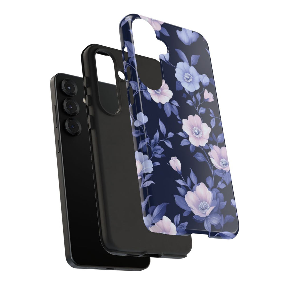 Dit ontwerp heeft een herhalend bloemenpatroon met verfijnde bloemen en bladeren in zachte tinten blauw en lichtroze. De bloemen zijn gedetailleerd uitgewerkt en worden omringd door smalle bladeren, allemaal geplaatst op een diepblauwe achtergrond. Het patroon straalt elegantie en romantiek uit en zorgt voor een rustige en stijlvolle uitstraling. Dit glanzende en stevige hoesje bestaat uit een dubbele laag van polycarbonaat en TPU, wat zorgt voor extra stevigheid en bescherming, geschikt voor gebruik buitenshuis en draadloos opladen.