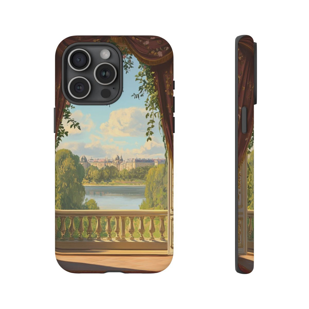 Dit ontwerp toont een elegant balkon met een open deur, omlijst door dieprode gordijnen met bloemmotieven. Buiten zie je een rustig landschap met een rivier, groene bomen en in de verte een stad onder een deels bewolkte hemel. Binnen staat een houten tafel met een groot boeket roze bloemen, terwijl klimplanten met roze bloesems de muren sieren. Het hoesje heeft een dubbele laag van polycarbonaat en TPU, een matte afwerking en is geschikt voor draadloos opladen.