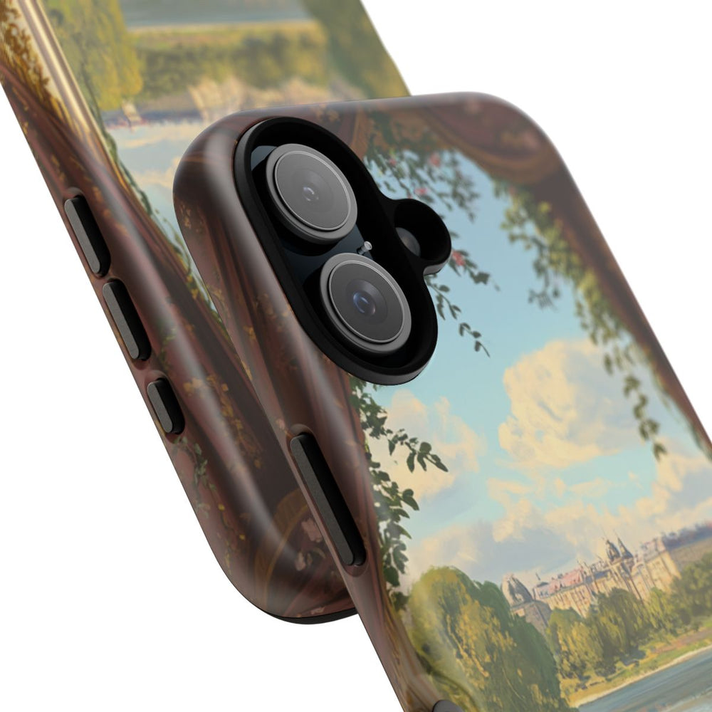Dit hoesje toont een sfeervol balkon, gezien door openstaande sierlijke deuren omlijst met bordeauxrode gordijnen voorzien van bloemenpatroon. Buiten ontvouwt zich een rustgevend landschap met een rivier, groene bomen en een stad aan de horizon onder een deels bewolkte hemel. Binnen zorgen bloemstukken met roze bloemen, gouden accenten en een rood tapijt met bloemmotief voor een elegante uitstraling. Het stevige, matte hoesje bestaat uit twee lagen: een polycarbonaat buitenkant en een TPU-binnenzijde. Dit zorgt voor extra bescherming en is geschikt voor draadloos opladen.