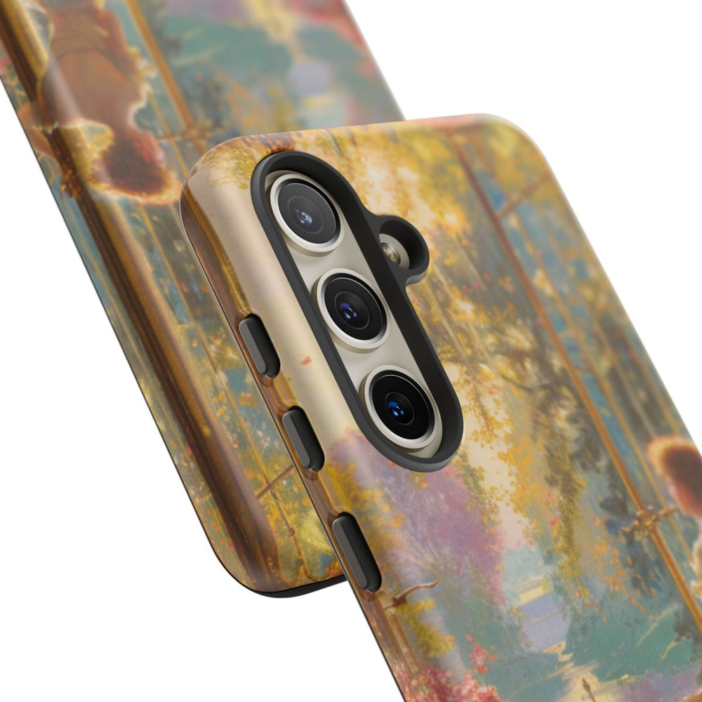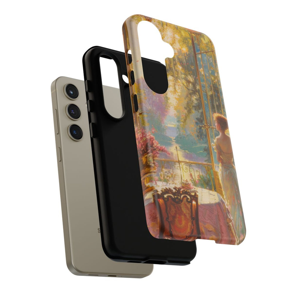 Dit hoesje toont een sfeervolle afbeelding van een vrouw in een sierlijke jurk bij grote open ramen. De kamer is rijkelijk ingericht met gedetailleerde stoelen, een tafel met een patroon en volop roze bloemen in vazen. Zonlicht valt naar binnen en zorgt voor een warme, uitnodigende sfeer. Het matte, stevige hoesje biedt dubbele bescherming en is geschikt voor draadloos opladen.