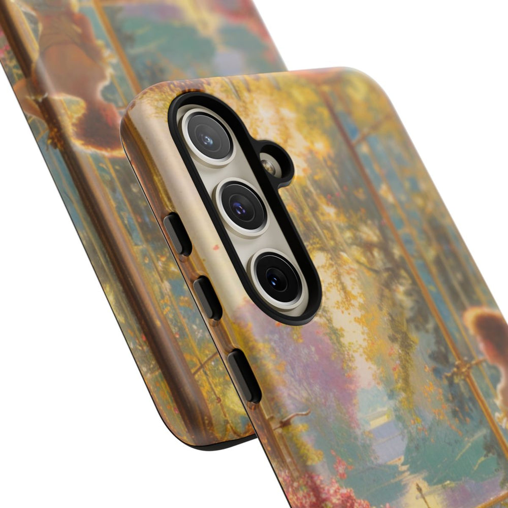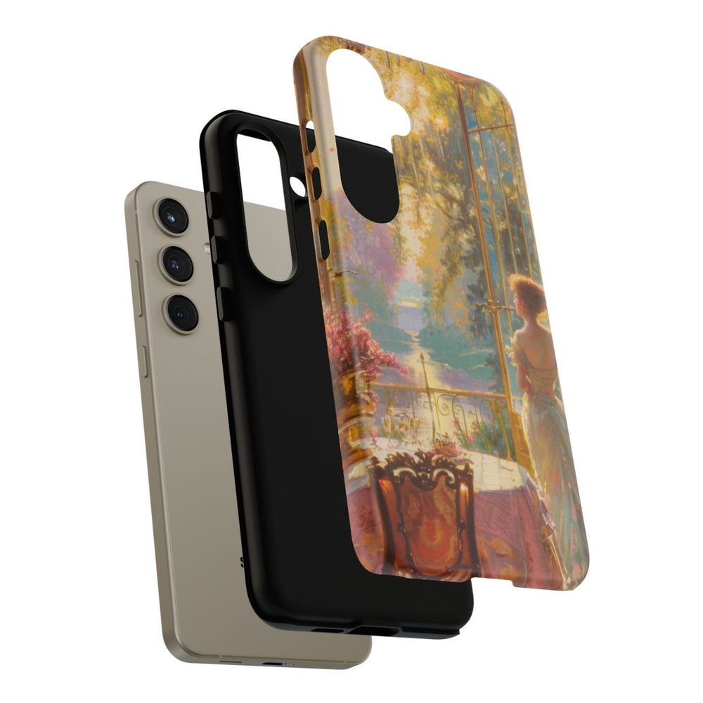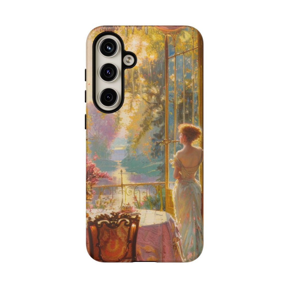 Dit hoesje toont een gedetailleerde schildering van een elegante vrouw die bij grote open ramen staat en uitkijkt op een zonnige tuin. De kamer is sfeervol ingericht met sierlijk meubilair, een ronde tafel met een rijk gedecoreerd kleed en volop roze bloemen in gouden vazen. Warm zonlicht valt door de ramen en laat de kleuren en structuren prachtig uitkomen. Het hoesje bestaat uit twee lagen van polycarbonaat en TPU en biedt uitstekende bescherming. Ondersteunt draadloos opladen.