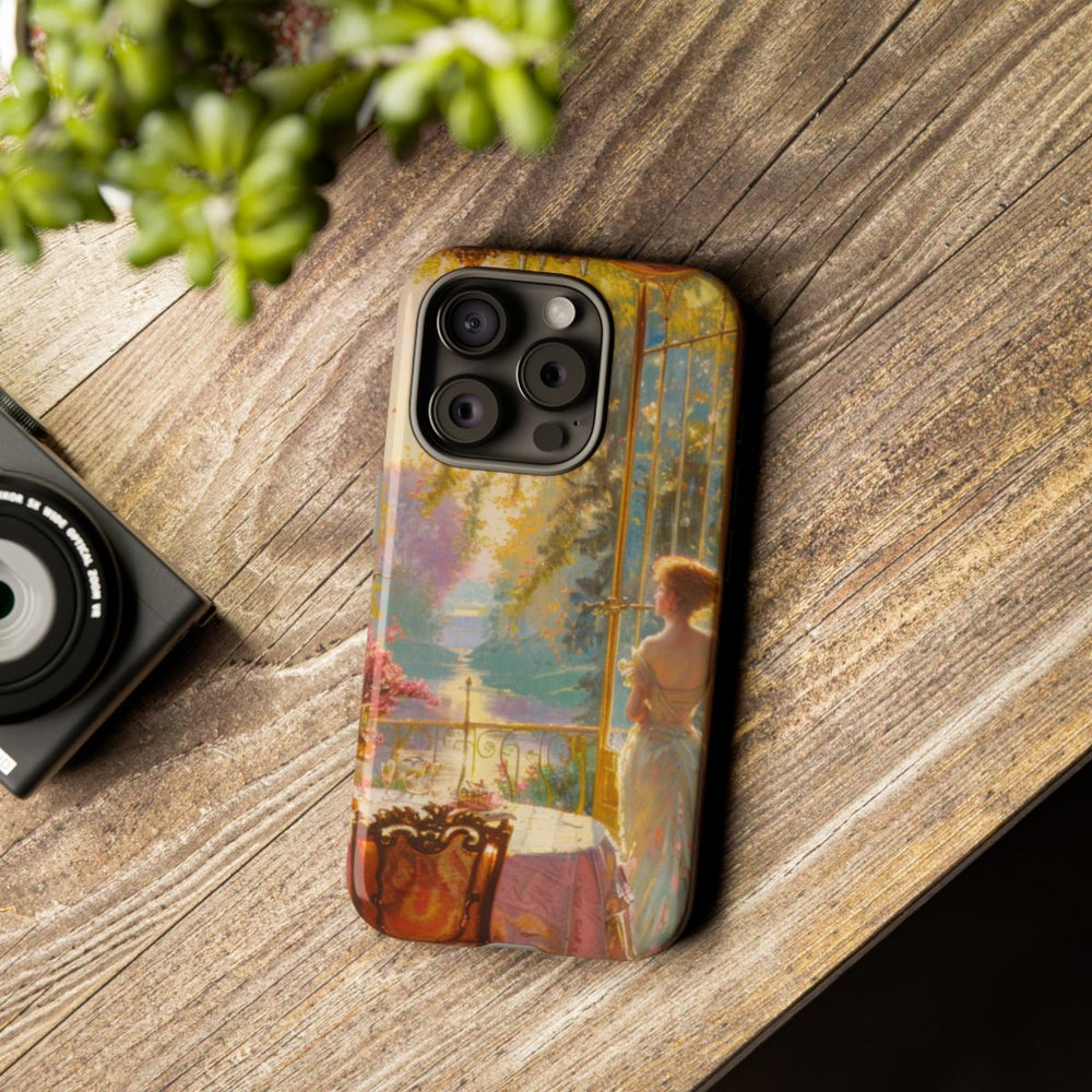 Dit hoesje toont een sfeervolle interieurafbeelding met een elegante vrouw bij grote, sierlijke ramen. Zij draagt een luchtige, lichtgekleurde jurk en kijkt uit op een zonnige tuin vol groen en bloemen. De kamer heeft warme tinten, zware gordijnen, een stijlvolle kroonluchter en een ronde tafel met een gedecoreerd tafelkleed. Twee grote bloemstukken in gouden vazen brengen levendige roze accenten. Het geheel wordt verlicht door zacht, goudkleurig zonlicht dat de rijke details en texturen extra benadrukt.