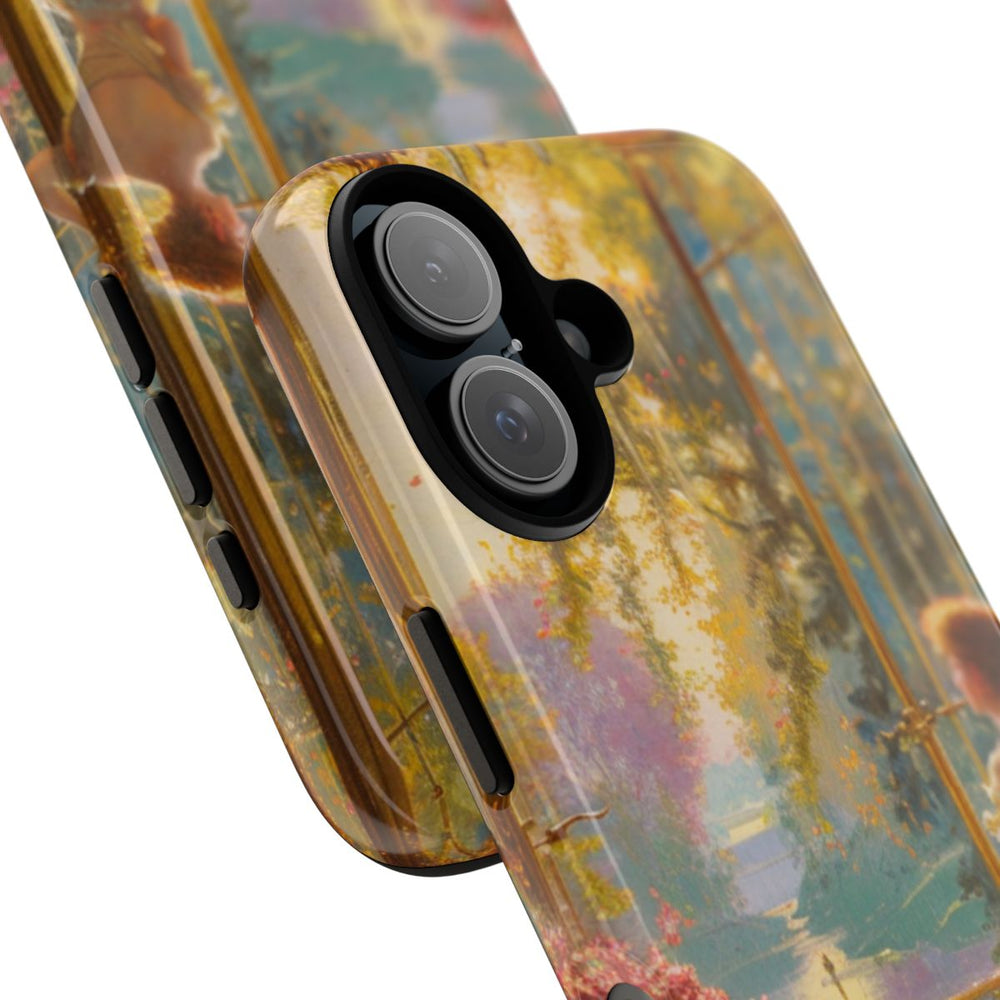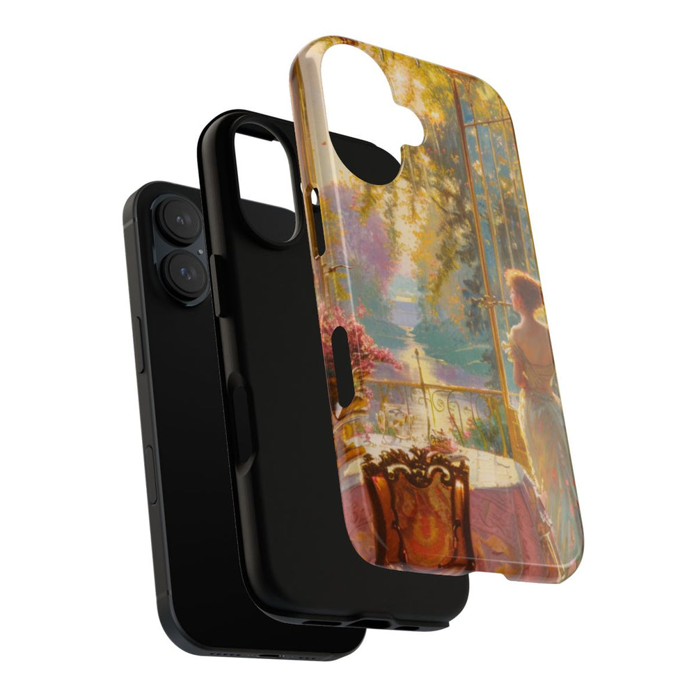 Dit hoesje toont een sfeervolle interieurafbeelding met een elegante vrouw bij grote, sierlijke ramen. Zij draagt een luchtige, lichtgekleurde jurk en kijkt uit op een zonnige tuin vol groen en bloemen. De kamer heeft warme tinten, zware gordijnen, een stijlvolle kroonluchter en een ronde tafel met een gedecoreerd tafelkleed. Twee grote bloemstukken in gouden vazen brengen levendige roze accenten. Het geheel wordt verlicht door zacht, goudkleurig zonlicht dat de rijke details en texturen extra benadrukt.