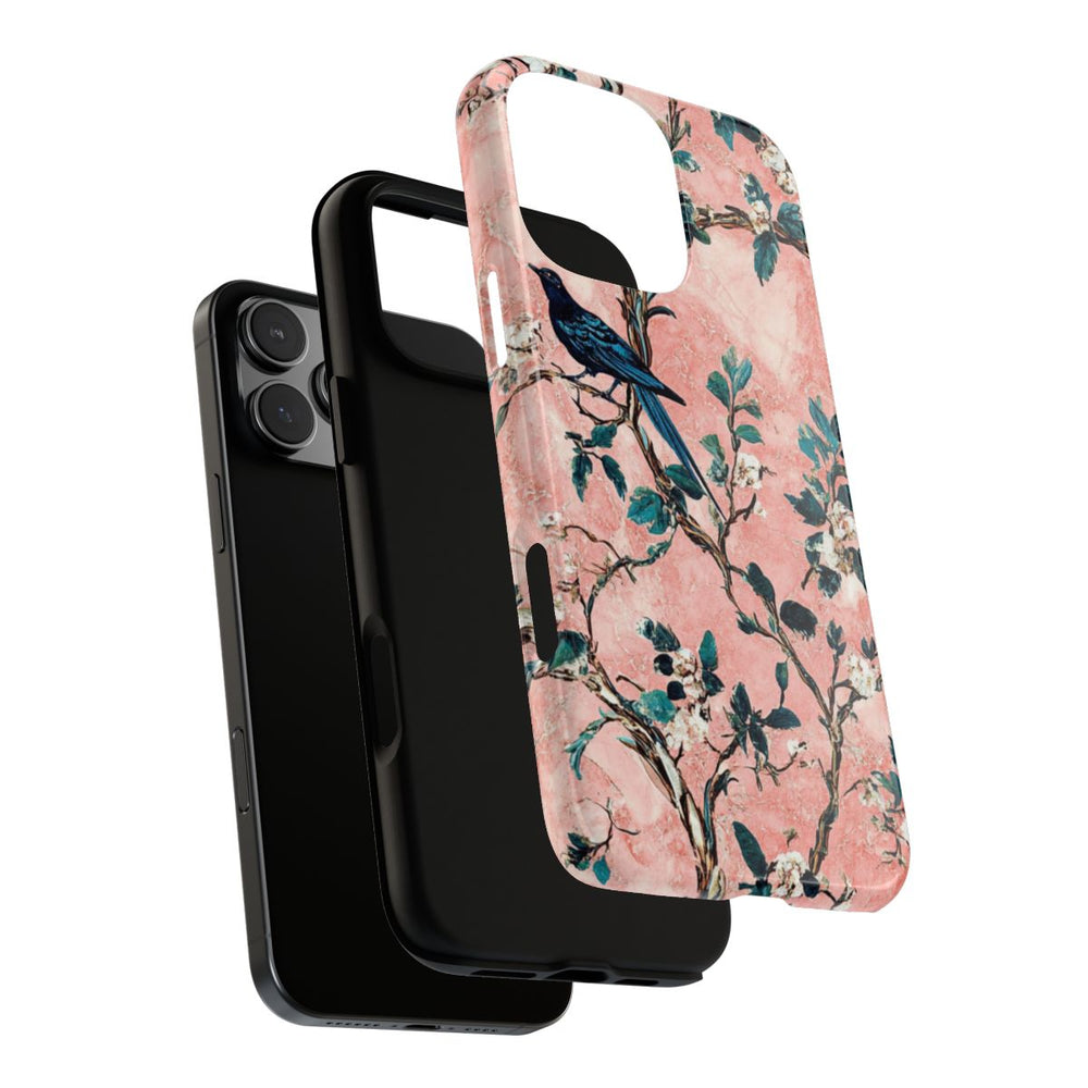 Dit hoesje toont exotische vogels die zitten op sierlijke takken met groene bladeren en witte bloemen. De achtergrond heeft een roze marmerpatroon met een mooie textuur, wat zorgt voor een elegante en diepe uitstraling. De vogels zijn gedetailleerd afgebeeld in levendige kleuren zoals blauw, geel en wit, wat het geheel een vrolijke en natuurlijke sfeer geeft. De afbeelding is gedrukt op een glanzend en stevig hoesje met een duurzame polycarbonaat buitenkant en een TPU binnenzijde. Het hoesje biedt uitstekende bescherming en ondersteunt draadloos opladen.