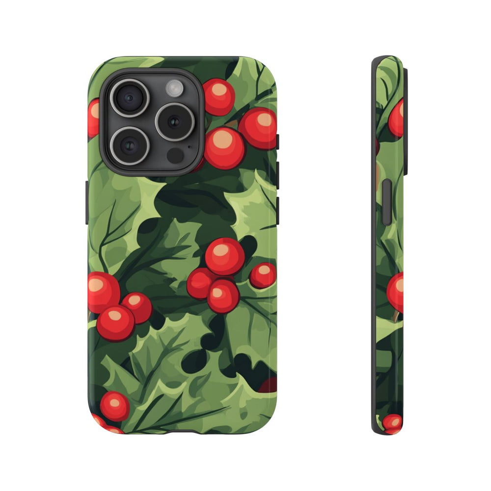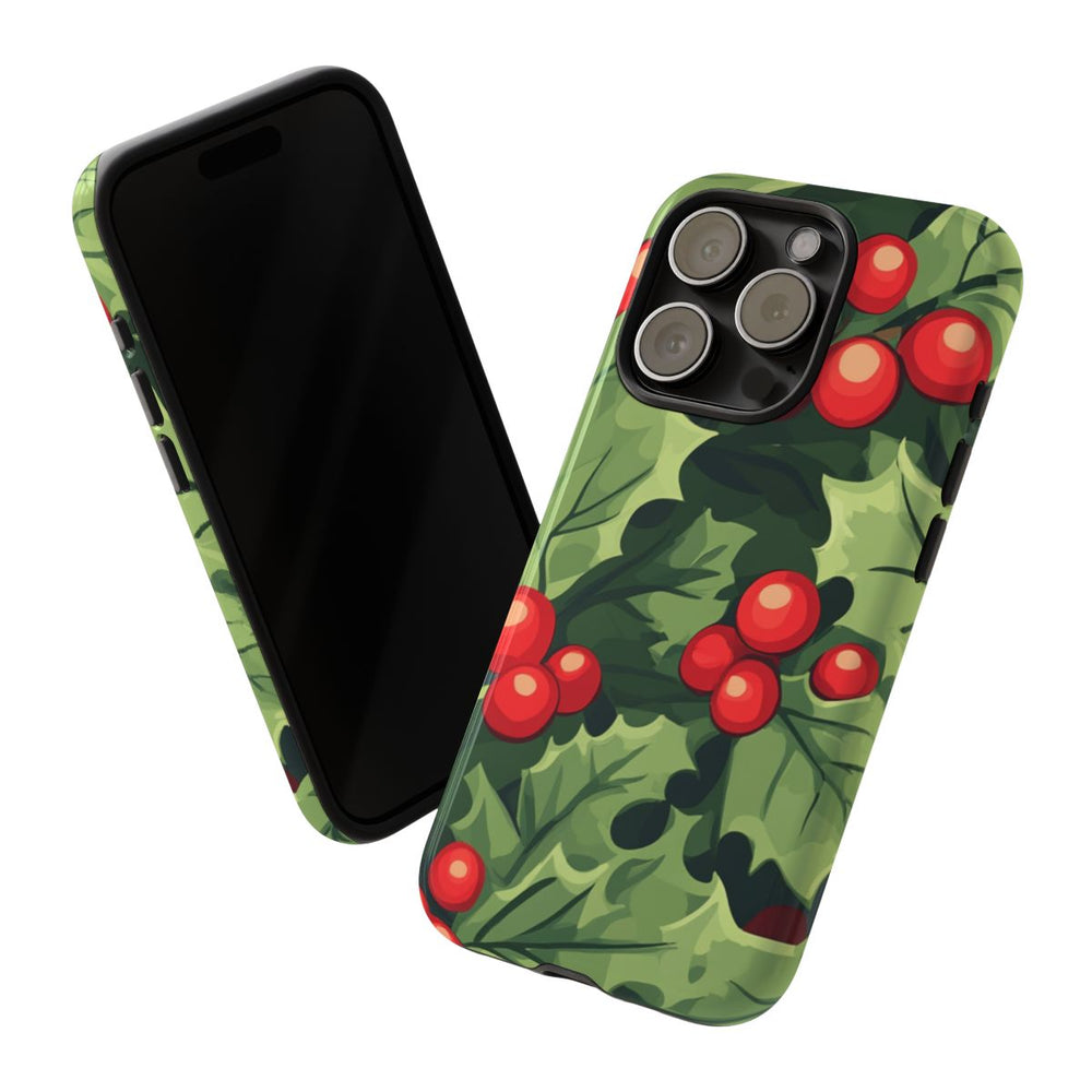 Dit hoesje is bedrukt met een doorlopend patroon van hulstbladeren en helderrode bessen. De bladeren zijn afgebeeld in verschillende groentinten met fijne nerven en spitse randen. De rode bessen zijn glanzend, rond en gelijkmatig over het patroon verspreid. De donkergroene achtergrond laat de feestelijke kleuren van de bladeren en bessen extra opvallen. Het hoesje heeft een glanzende afwerking en bestaat uit een stevige polycarbonaat buitenkant met een TPU binnenlaag voor dubbele bescherming. Ondersteunt draadloos opladen.