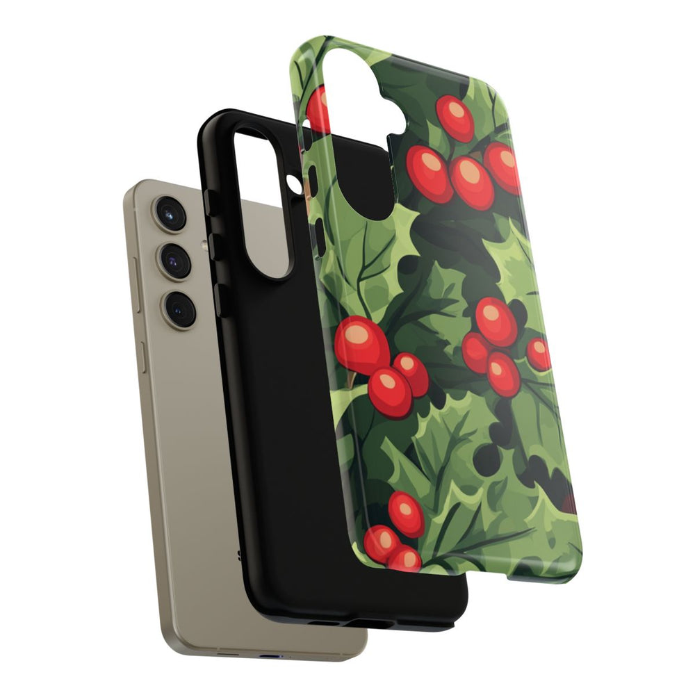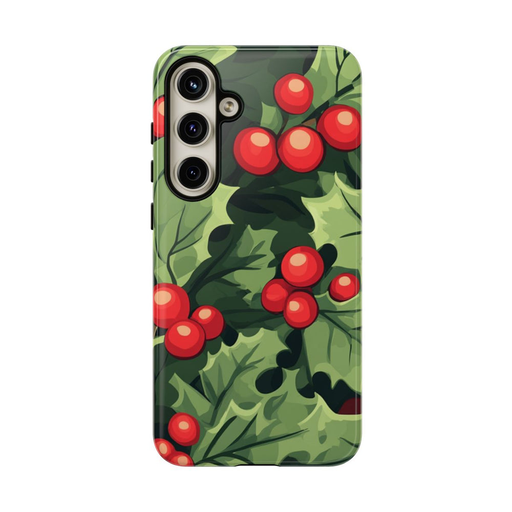Dit hoesje is bedrukt met een doorlopend patroon van hulstbladeren en helderrode bessen. De bladeren zijn afgebeeld in verschillende groentinten met fijne nerven en spitse randen. De rode bessen zijn glanzend, rond en gelijkmatig over het patroon verspreid. De donkergroene achtergrond laat de feestelijke kleuren van de bladeren en bessen extra opvallen. Het hoesje heeft een glanzende afwerking en bestaat uit een stevige polycarbonaat buitenkant met een TPU binnenlaag voor dubbele bescherming. Ondersteunt draadloos opladen.