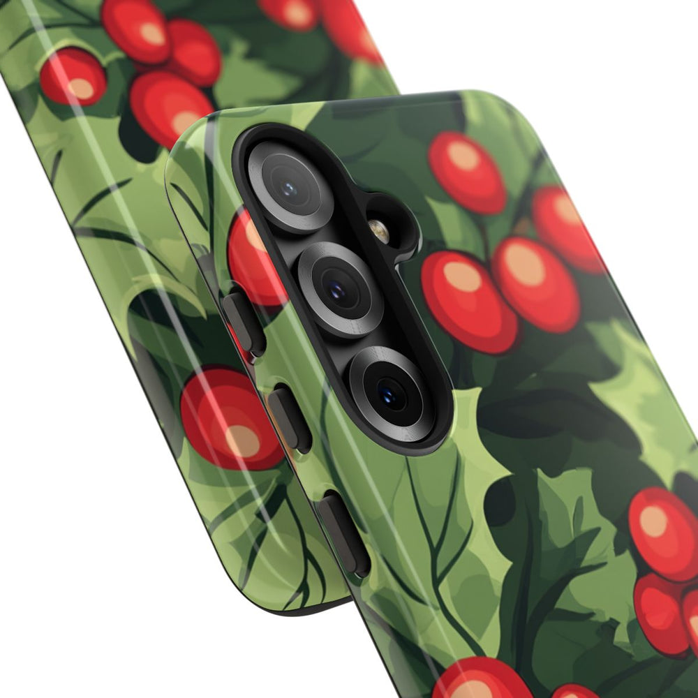 Dit hoesje is bedrukt met een doorlopend patroon van hulstbladeren en helderrode bessen. De bladeren zijn afgebeeld in verschillende groentinten met fijne nerven en spitse randen. De rode bessen zijn glanzend, rond en gelijkmatig over het patroon verspreid. De donkergroene achtergrond laat de feestelijke kleuren van de bladeren en bessen extra opvallen. Het hoesje heeft een glanzende afwerking en bestaat uit een stevige polycarbonaat buitenkant met een TPU binnenlaag voor dubbele bescherming. Ondersteunt draadloos opladen.