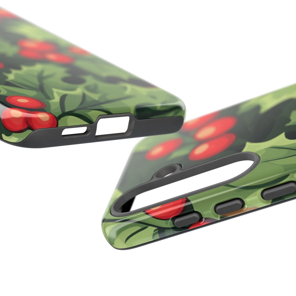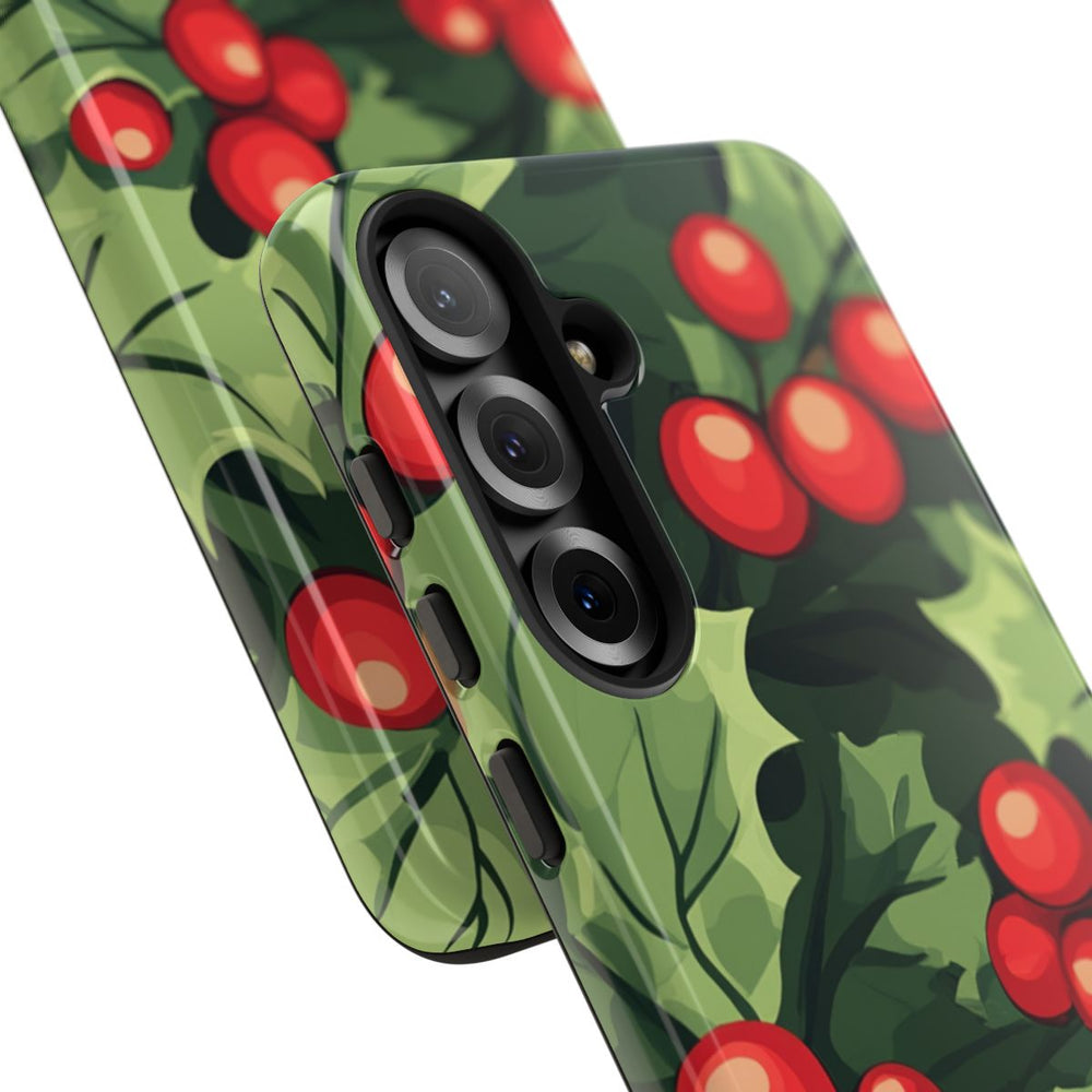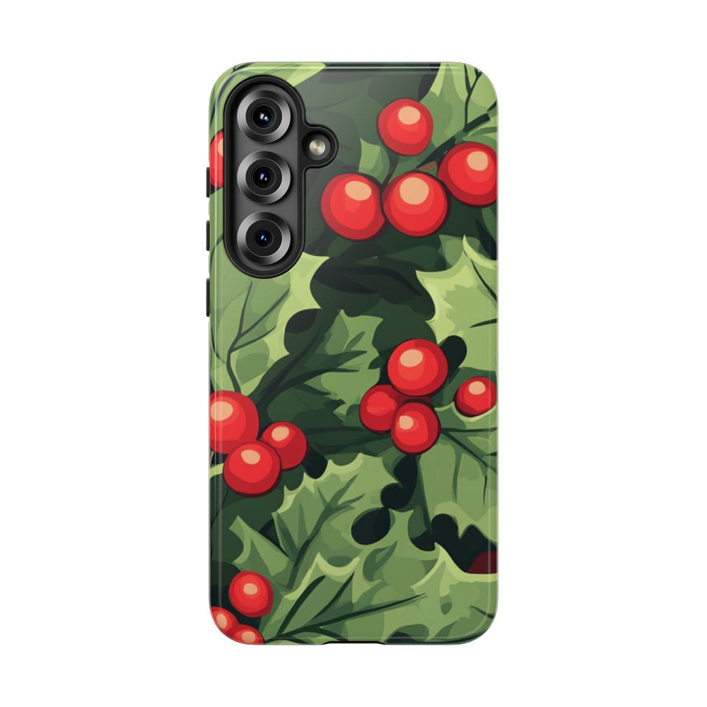 Dit hoesje is bedrukt met een doorlopend patroon van hulstbladeren en helderrode bessen. De bladeren zijn afgebeeld in verschillende groentinten met fijne nerven en spitse randen. De rode bessen zijn glanzend, rond en gelijkmatig over het patroon verspreid. De donkergroene achtergrond laat de feestelijke kleuren van de bladeren en bessen extra opvallen. Het hoesje heeft een glanzende afwerking en bestaat uit een stevige polycarbonaat buitenkant met een TPU binnenlaag voor dubbele bescherming. Ondersteunt draadloos opladen.