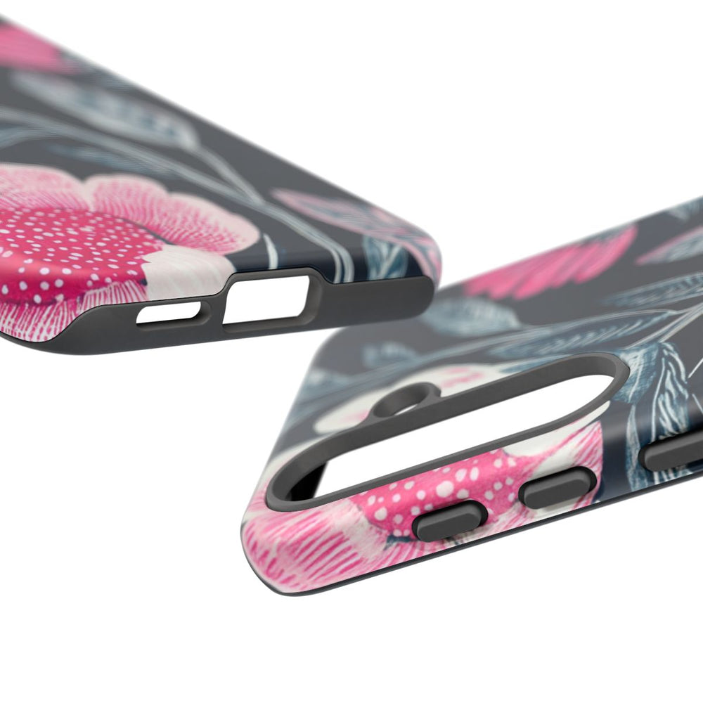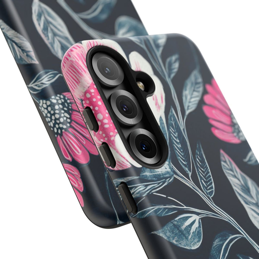 Dit hoesje is voorzien van een naadloos bloemenpatroon met grote, felroze bloemen en witte accenten op een donkerblauwe achtergrond. De bloemen zijn gedetailleerd uitgewerkt met fijne bloemblaadjes en gestippelde harten, omringd door slanke bladeren in grijze en witte tinten. Het patroon is opvallend en levendig, waardoor het mooi afsteekt tegen de donkere achtergrond. De print is aangebracht op een mat hoesje van stevig polycarbonaat en TPU, dat bestaat uit twee lagen voor extra bescherming en geschikt is voor draadloos opladen.