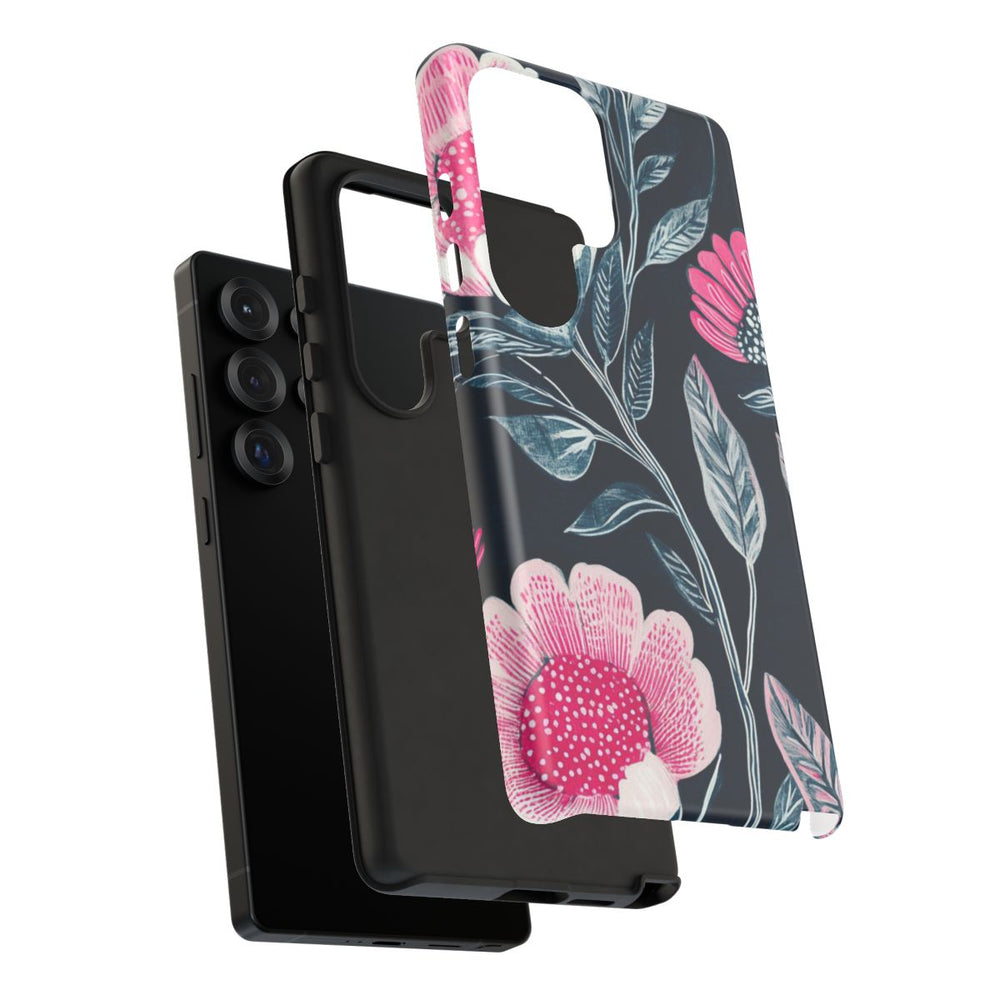 Dit hoesje is voorzien van een naadloos bloemenpatroon met grote, felroze bloemen en witte accenten op een donkerblauwe achtergrond. De bloemen zijn gedetailleerd uitgewerkt met fijne bloemblaadjes en gestippelde harten, omringd door slanke bladeren in grijze en witte tinten. Het patroon is opvallend en levendig, waardoor het mooi afsteekt tegen de donkere achtergrond. De print is aangebracht op een mat hoesje van stevig polycarbonaat en TPU, dat bestaat uit twee lagen voor extra bescherming en geschikt is voor draadloos opladen.