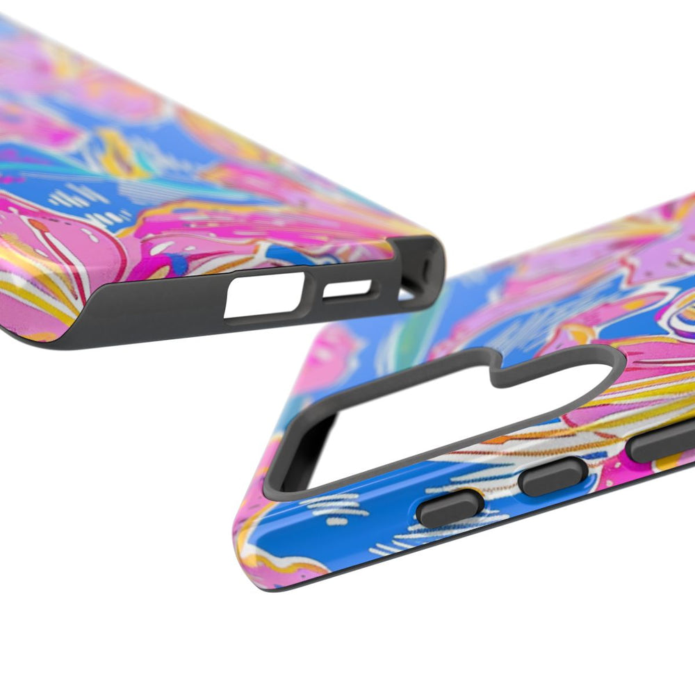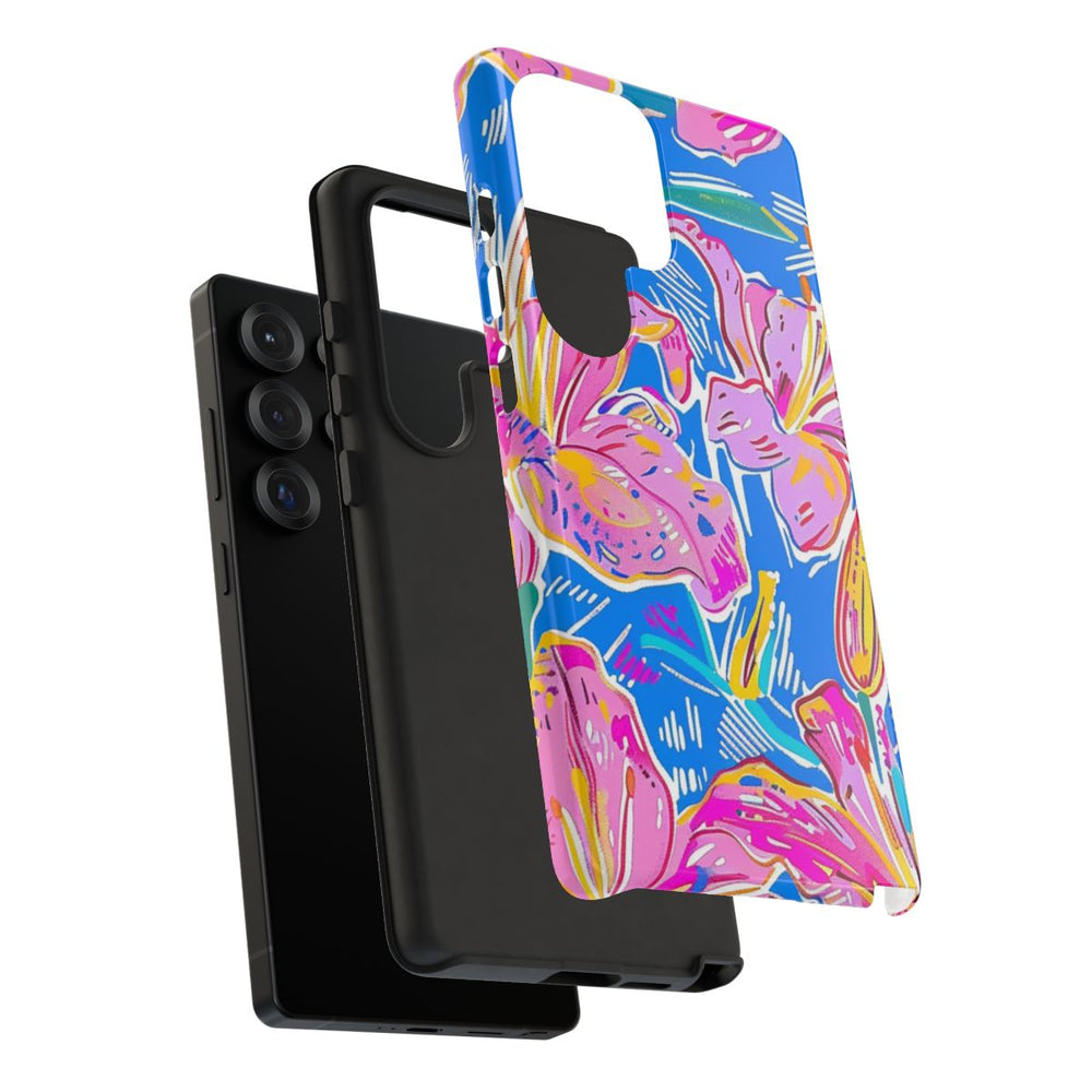 Dit hoesje heeft een opvallende bloemenprint met grote roze lelies, aangevuld met gele en oranje accenten. De bloemen komen mooi uit tegen een heldere blauwe achtergrond, wat zorgt voor een levendig en kleurrijk contrast. Groene bladeren en witte, schetsmatige lijnen geven het patroon extra diepte en structuur. Het hoesje is glanzend afgewerkt en bestaat uit een stevige polycarbonaat buitenkant met een TPU binnenzijde. Dankzij deze dubbele bescherming is je telefoon goed bestand tegen stoten en krassen. Bovendien ondersteunt het hoesje draadloos opladen en is het ontworpen voor langdurig gebruik, ook buitenshuis.