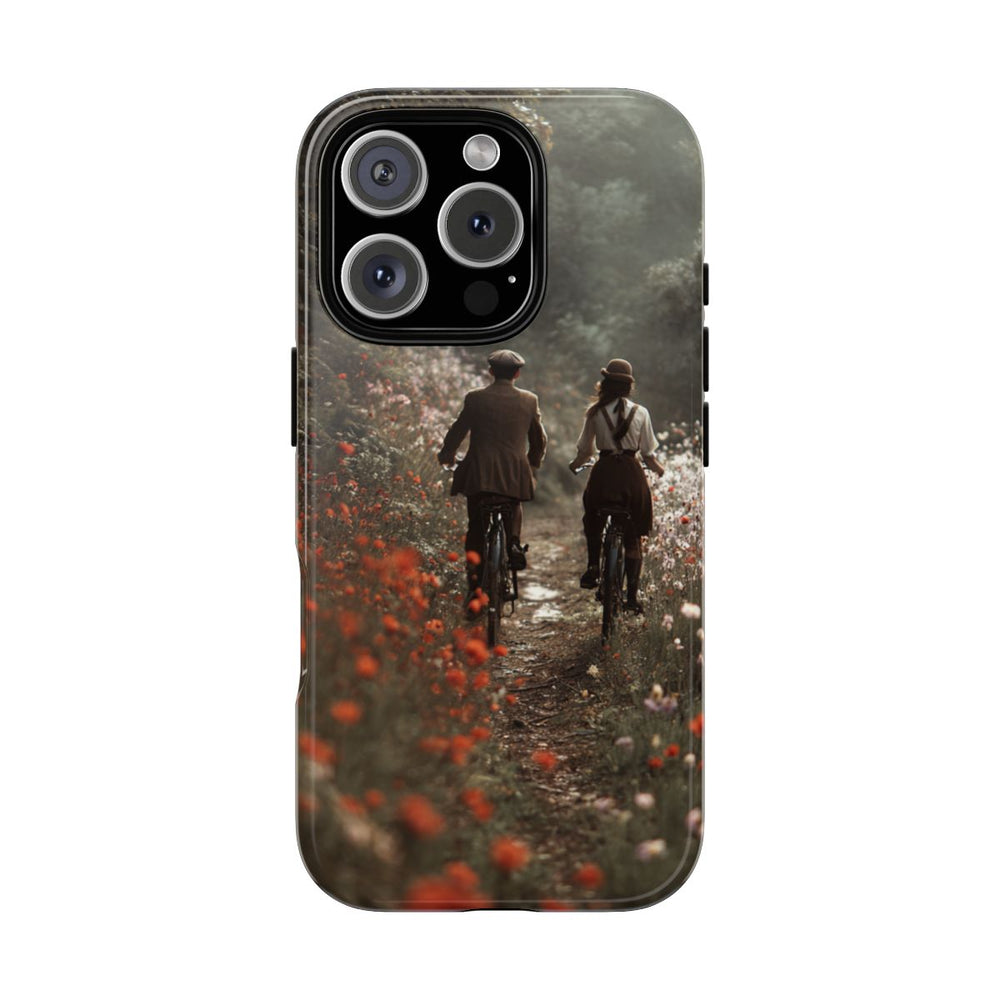 Dit hoesje toont een romantisch tafereel van een stelletje dat samen fietst over een smal zandpad, omringd door uitbundige bloemen en weelderig groen. Het zachte, diffuse licht geeft de afbeelding een dromerige en nostalgische sfeer. De vintage kleding en hoeden van het stel benadrukken de tijdloze uitstraling. Langs het pad bloeien felgekleurde rode, witte en roze bloemen, terwijl bomen en bladeren samen een natuurlijk bladerdak vormen. Dit glanzende, stevige hoesje biedt dubbele bescherming en ondersteunt draadloos opladen.