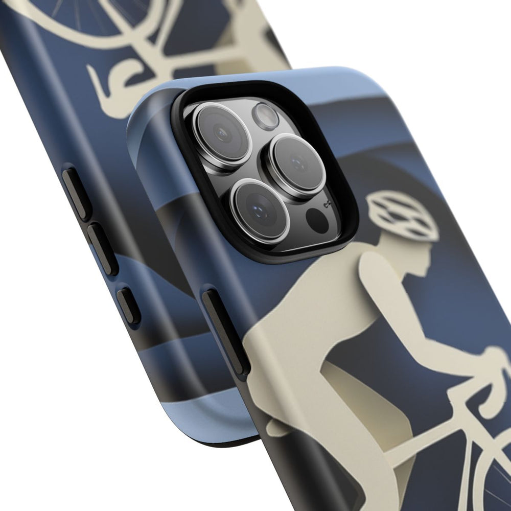 Dit hoesje heeft een ontwerp met een fietser en fiets in een papieren uitsnede-stijl. De fietser en fiets zijn uitgevoerd in een crèmekleur en staan afgebeeld tegen een gelaagd landschap van blauwe en crèmekleurige vormen, die samen heuvels en bomen voorstellen. De achtergrond bestaat uit verschillende tinten blauw voor een gevoel van diepte. Het hoesje is mat, stevig en heeft twee lagen: een buitenkant van polycarbonaat en een binnenzijde van TPU. Geschikt voor draadloos opladen.