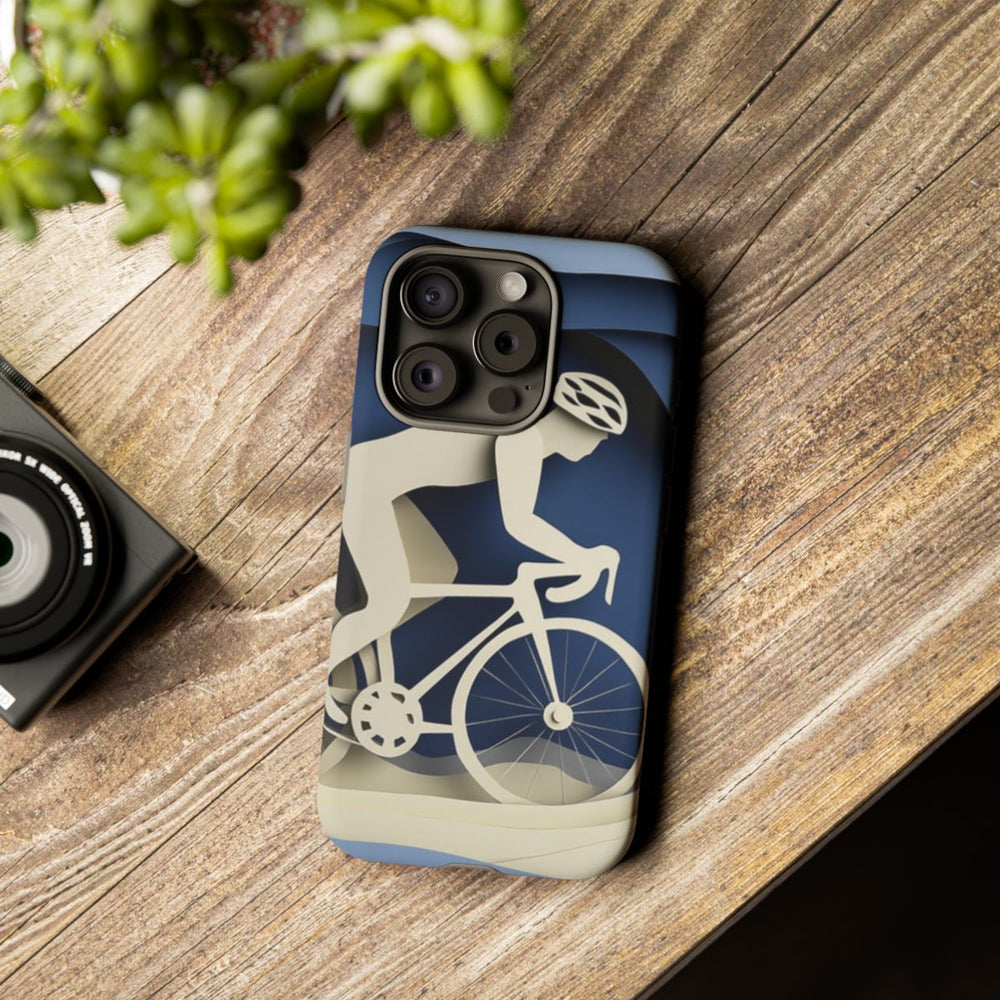 Dit ontwerp toont een fietser in papieren uitsnede-stijl die door een gelaagd blauw landschap rijdt. Op de achtergrond zijn gestileerde bomen en glooiende heuvels te zien in verschillende blauwtinten, wat zorgt voor diepte. De fietser en fiets zijn uitgevoerd in een lichte crèmekleur, wat mooi contrasteert met de blauwe omgeving. Het hoesje bestaat uit twee lagen met een matte afwerking en is gemaakt van polycarbonaat en TPU. Ondersteunt draadloos opladen, maar is niet geschikt voor MagSafe.