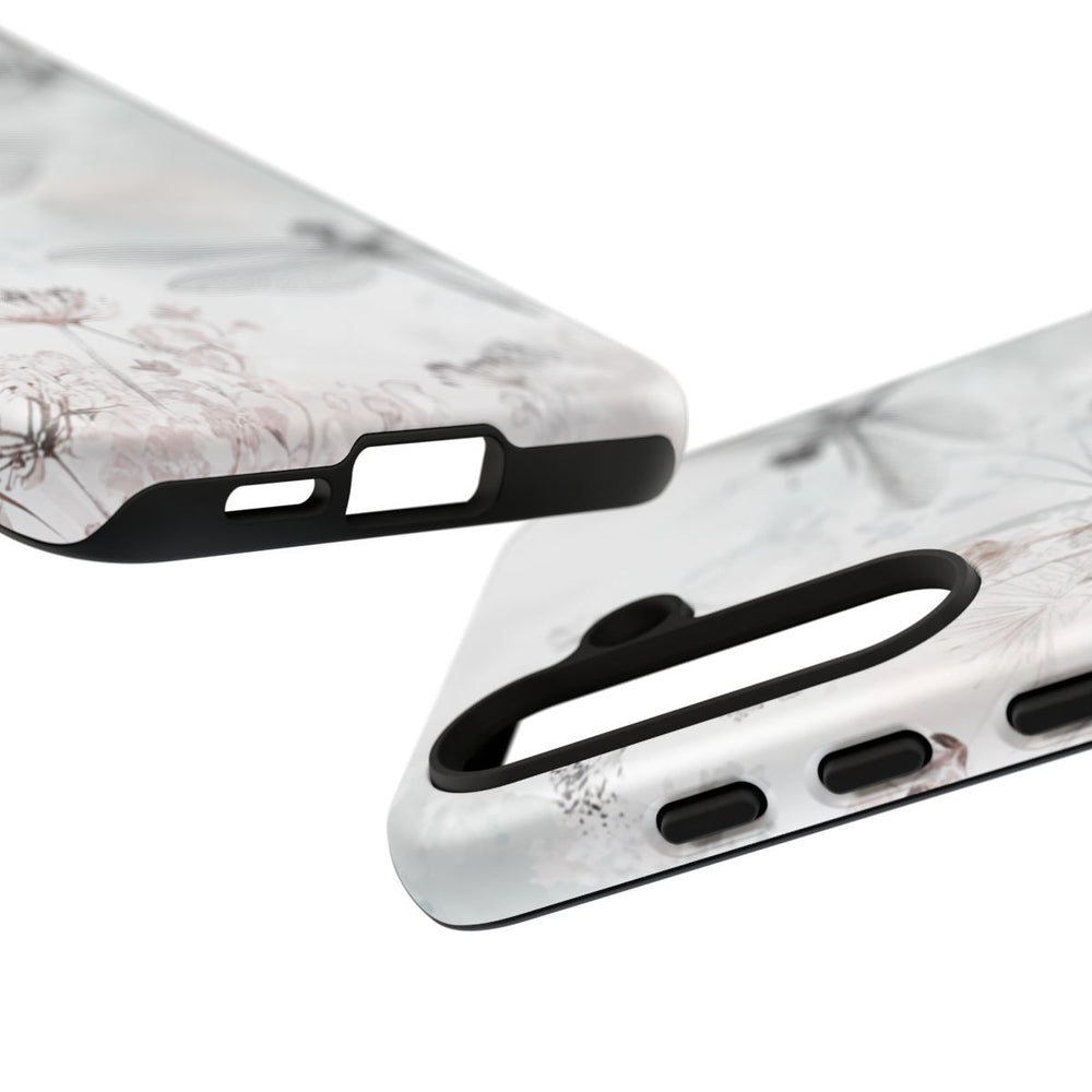 Dit hoesje heeft een verfijnd ontwerp met drie gedetailleerde grijze libellen met transparante vleugels op een zachte witte achtergrond. Rondom de libellen zijn subtiele bloemen afgebeeld in lichte grijs- en bruintinten, wat zorgt voor een elegante en luchtige aquareleffect. Het ontwerp is gedrukt op een mat, stevig hoesje van polycarbonaat en TPU, dat dubbele bescherming biedt en geschikt is voor draadloos opladen. Het geheel oogt stijlvol en ingetogen.