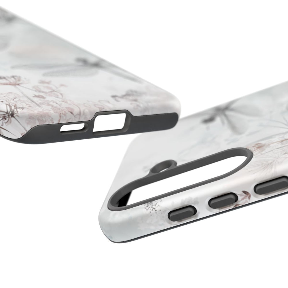 Dit ontwerp toont drie gedetailleerde libellen met transparante vleugels die tussen zachte bloemen en bladeren vliegen. De illustratie is uitgevoerd in lichtgrijze en zachtroze tinten met een aquareleffect op een witte achtergrond. Het telefoonhoesje heeft een dubbele laag van polycarbonaat en TPU, waardoor het duurzaam is en optimale bescherming biedt. Geschikt voor draadloos opladen.