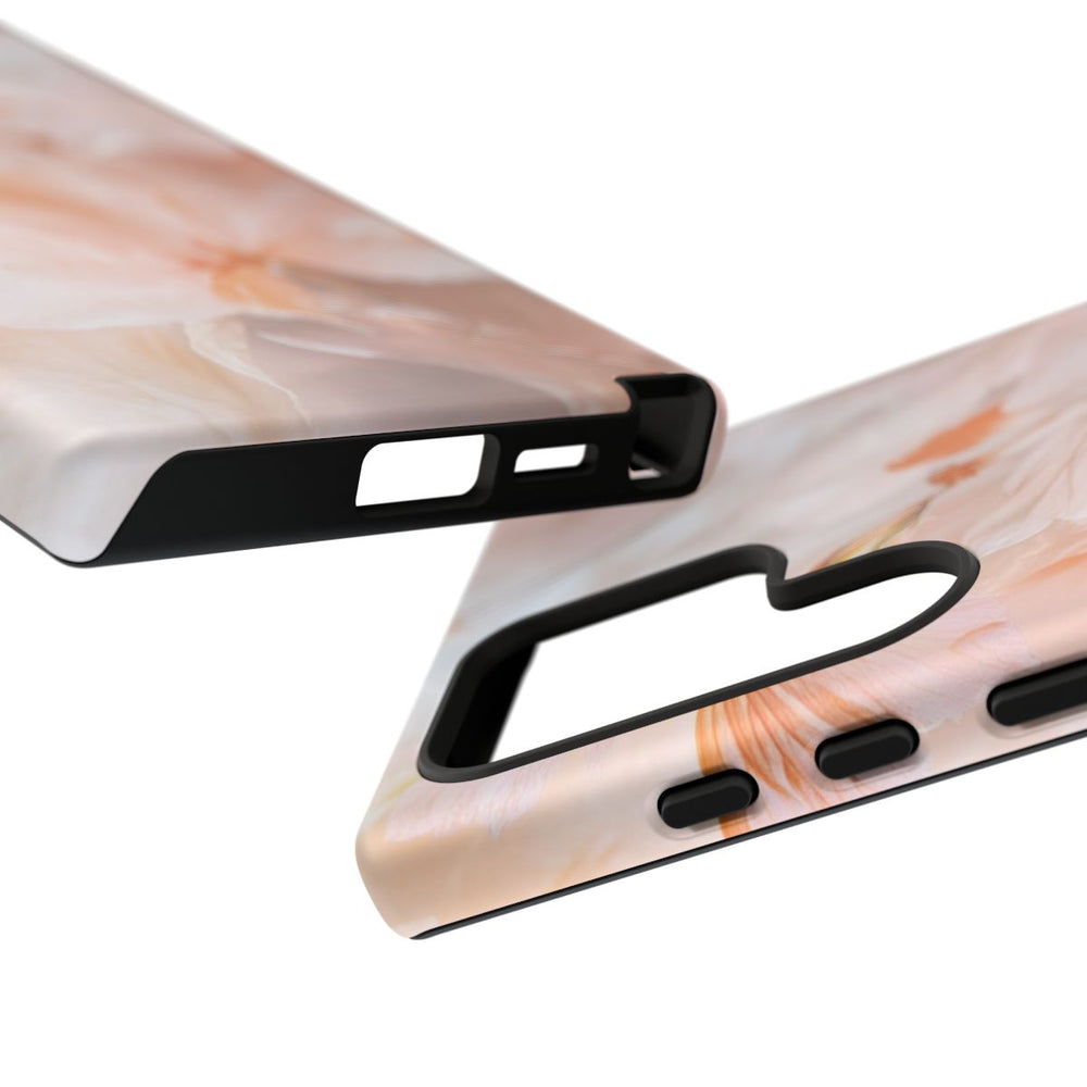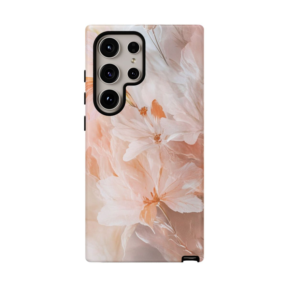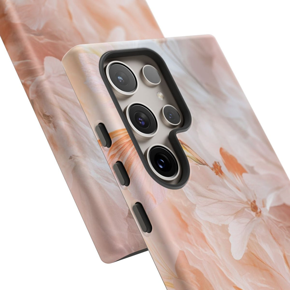 Dit hoesje heeft een abstracte close-up van tere bloemen met zachte, doorschijnende bloemblaadjes in pastel perzik- en wittinten. Het ontwerp straalt een dromerige, bijna sprookjesachtige sfeer uit door het zachte licht en subtiele texturen. Het matte hoesje bestaat uit twee lagen van polycarbonaat en TPU voor extra stevigheid en bescherming. Geschikt voor draadloos opladen; niet geschikt voor MagSafe.