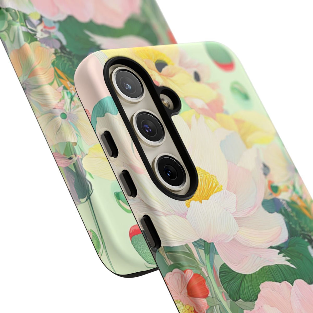 Dit hoesje is voorzien van een gedetailleerde illustratie van diverse zomerbloemen in zachte pasteltinten. Grote bloemen in wit, roze, geel en zwart komen mooi naar voren tussen weelderige groene bladeren en stelen. De achtergrond combineert zachte roze en lichtgroene tinten, wat het bloemrijke ontwerp een lichte en verfijnde uitstraling geeft. Het hoesje bestaat uit twee lagen mat polycarbonaat en TPU voor extra stevigheid en bescherming, en is geschikt voor draadloos opladen.