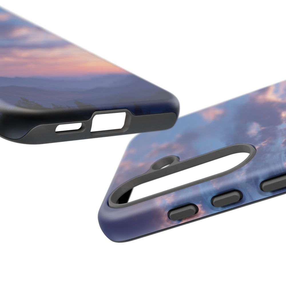 Dit hoesje toont een fotorealistisch berglandschap tijdens zonsopkomst, waarbij berglagen langzaam vervagen naar de horizon. De lucht is gevuld met indrukwekkende wolken, verlicht door zachte roze en paarse tinten van de opkomende zon. Op de voorgrond zijn donkere silhouetten van bomen en rotsachtig terrein zichtbaar. De afbeelding is gedrukt op een matte, stevige hoes met dubbele laag van polycarbonaat en TPU, die zorgt voor extra bescherming en geschikt is voor draadloos opladen.