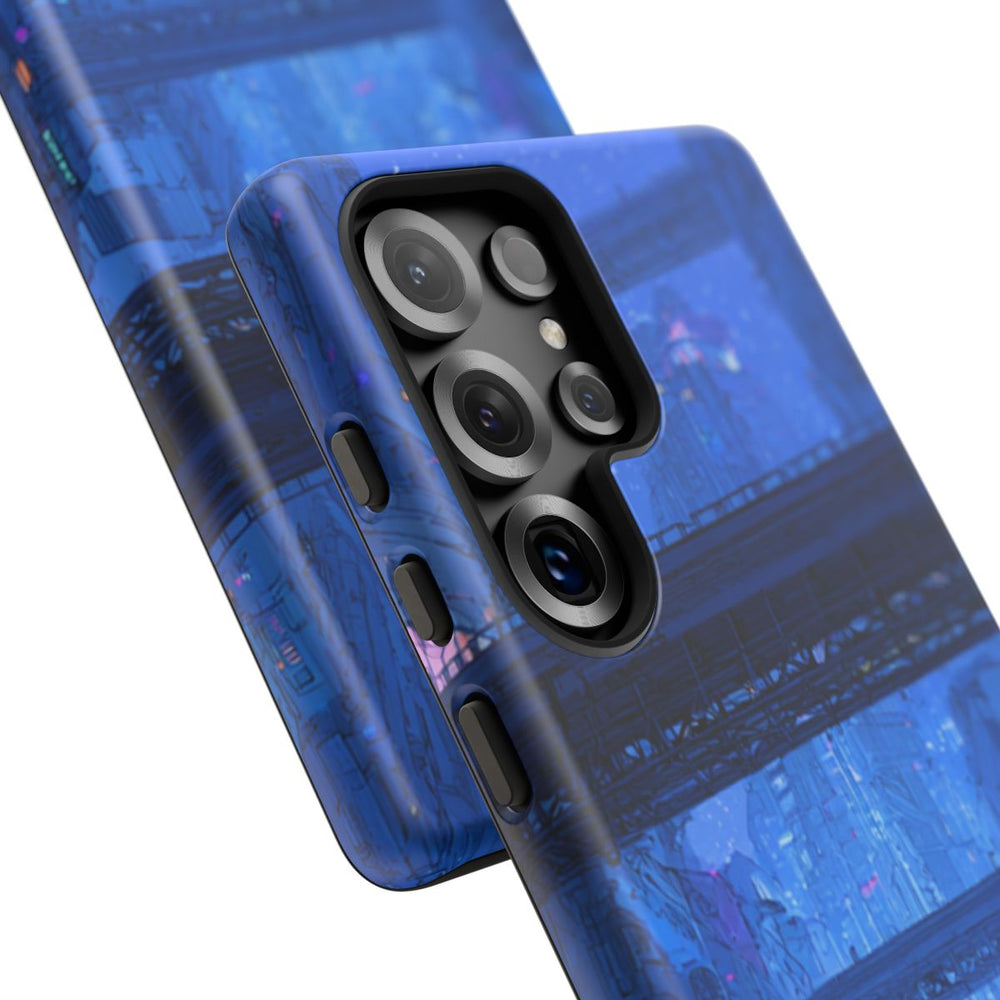 Dit hoesje heeft een gedetailleerde afbeelding van een futuristisch stadslandschap in verschillende blauwtinten. Hoge gebouwen met verlichte ramen en neonreclames staan langs een brede straat die in de verte verdwijnt. Op verschillende hoogtes verbinden verhoogde loopbruggen en bruggen de gebouwen met elkaar. De sterrenhemel zorgt voor extra diepte en sfeer. Het hoesje bestaat uit twee lagen van polycarbonaat en TPU, waardoor het stevig is en geschikt voor draadloos opladen.