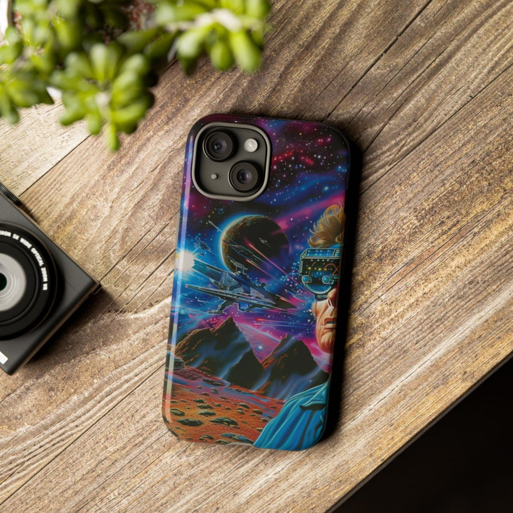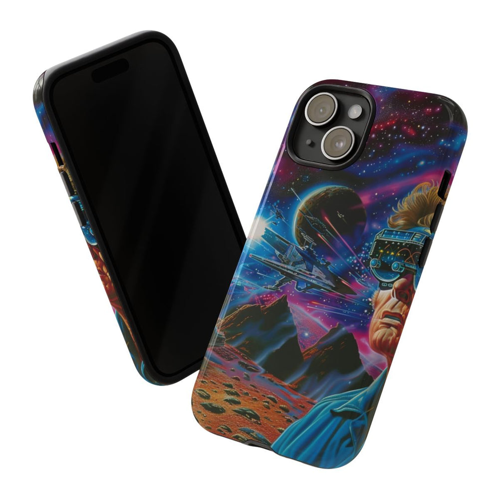 Dit telefoonhoesje toont een futuristisch ruimtegevecht met op de voorgrond een persoon die geavanceerde virtuelebril draagt. Op de achtergrond zie je een kleurrijk kosmisch landschap met nevels, verre planeten en sterren. Verschillende ruimteschepen zijn verwikkeld in een dynamisch gevecht en schieten heldere laserstralen over het tafereel. Op de voorgrond zorgen rotsachtige terreinen en bergen voor een extra sciencefiction-sfeer. Het ontwerp is levendig en kenmerkt zich door opvallende blauwe, paarse en rode tinten. Het hoesje bestaat uit twee lagen van polycarbonaat en TPU, wat zorgt voor extra stevigheid en ondersteuning van draadloos opladen.