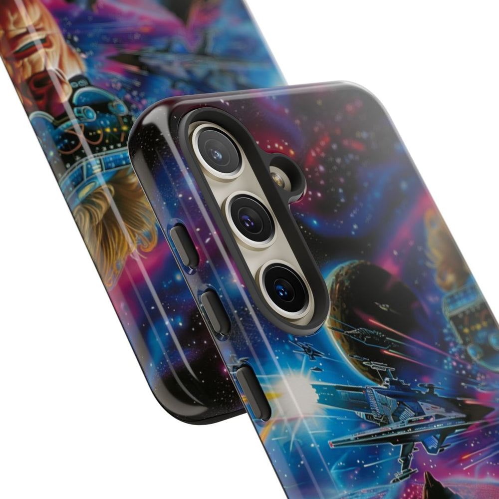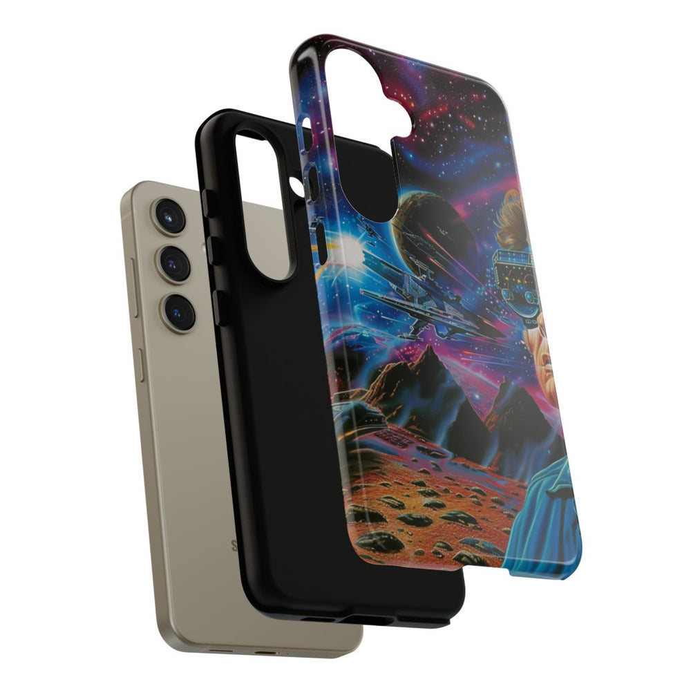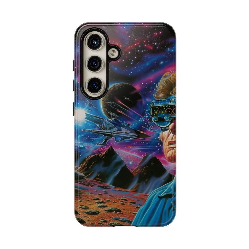 Dit telefoonhoesje toont een futuristisch ruimtegevecht met op de voorgrond een persoon die geavanceerde virtuelebril draagt. Op de achtergrond zie je een kleurrijk kosmisch landschap met nevels, verre planeten en sterren. Verschillende ruimteschepen zijn verwikkeld in een dynamisch gevecht en schieten heldere laserstralen over het tafereel. Op de voorgrond zorgen rotsachtige terreinen en bergen voor een extra sciencefiction-sfeer. Het ontwerp is levendig en kenmerkt zich door opvallende blauwe, paarse en rode tinten. Het hoesje bestaat uit twee lagen van polycarbonaat en TPU, wat zorgt voor extra stevigheid en ondersteuning van draadloos opladen.