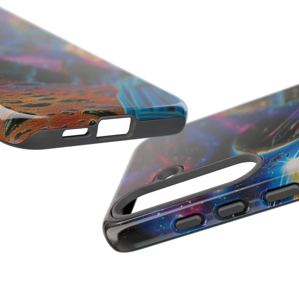 Dit telefoonhoesje toont een futuristisch ruimtegevecht met op de voorgrond een persoon die geavanceerde virtuelebril draagt. Op de achtergrond zie je een kleurrijk kosmisch landschap met nevels, verre planeten en sterren. Verschillende ruimteschepen zijn verwikkeld in een dynamisch gevecht en schieten heldere laserstralen over het tafereel. Op de voorgrond zorgen rotsachtige terreinen en bergen voor een extra sciencefiction-sfeer. Het ontwerp is levendig en kenmerkt zich door opvallende blauwe, paarse en rode tinten. Het hoesje bestaat uit twee lagen van polycarbonaat en TPU, wat zorgt voor extra stevigheid en ondersteuning van draadloos opladen.