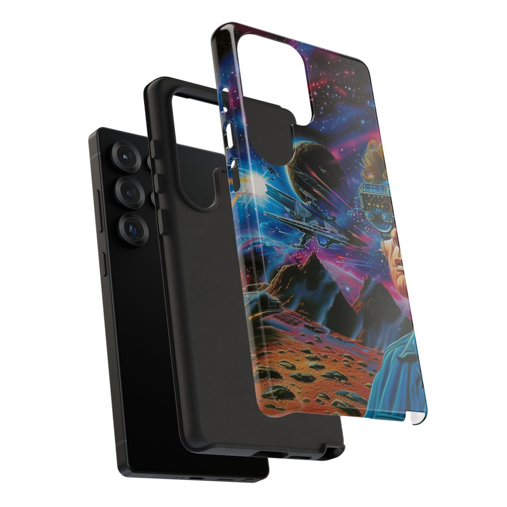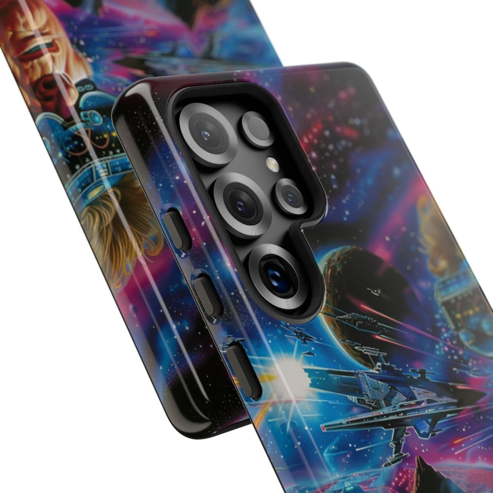 Dit telefoonhoesje toont een futuristisch ruimtegevecht met op de voorgrond een persoon die geavanceerde virtuelebril draagt. Op de achtergrond zie je een kleurrijk kosmisch landschap met nevels, verre planeten en sterren. Verschillende ruimteschepen zijn verwikkeld in een dynamisch gevecht en schieten heldere laserstralen over het tafereel. Op de voorgrond zorgen rotsachtige terreinen en bergen voor een extra sciencefiction-sfeer. Het ontwerp is levendig en kenmerkt zich door opvallende blauwe, paarse en rode tinten. Het hoesje bestaat uit twee lagen van polycarbonaat en TPU, wat zorgt voor extra stevigheid en ondersteuning van draadloos opladen.
