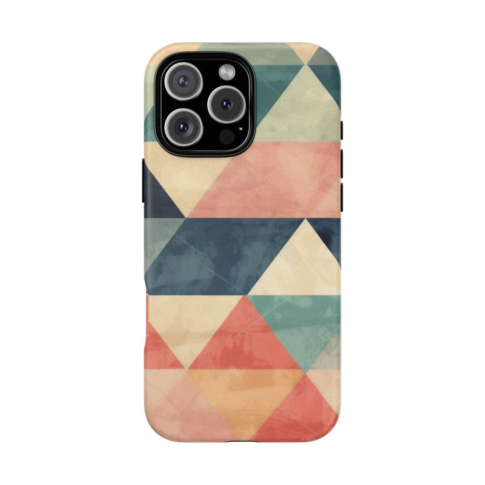 Dit telefoonhoesje heeft een herhalend patroon van driehoeken in gedempte kleuren zoals blauw, koraal, beige en teal. De driehoeken zijn in horizontale rijen geplaatst, wat zorgt voor een geometrisch en abstract effect. De kleuren hebben een licht verweerde, vintage uitstraling die het ontwerp een subtiel stoer karakter geeft. Het patroon is bedrukt op een mat hoesje met een stevige dubbele laag van polycarbonaat en TPU, voor optimale bescherming en duurzaamheid. Geschikt voor draadloos opladen.
