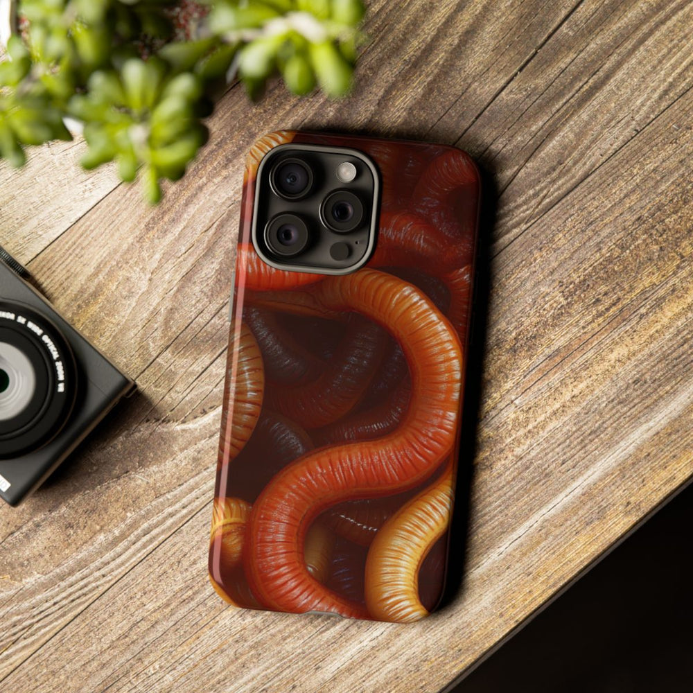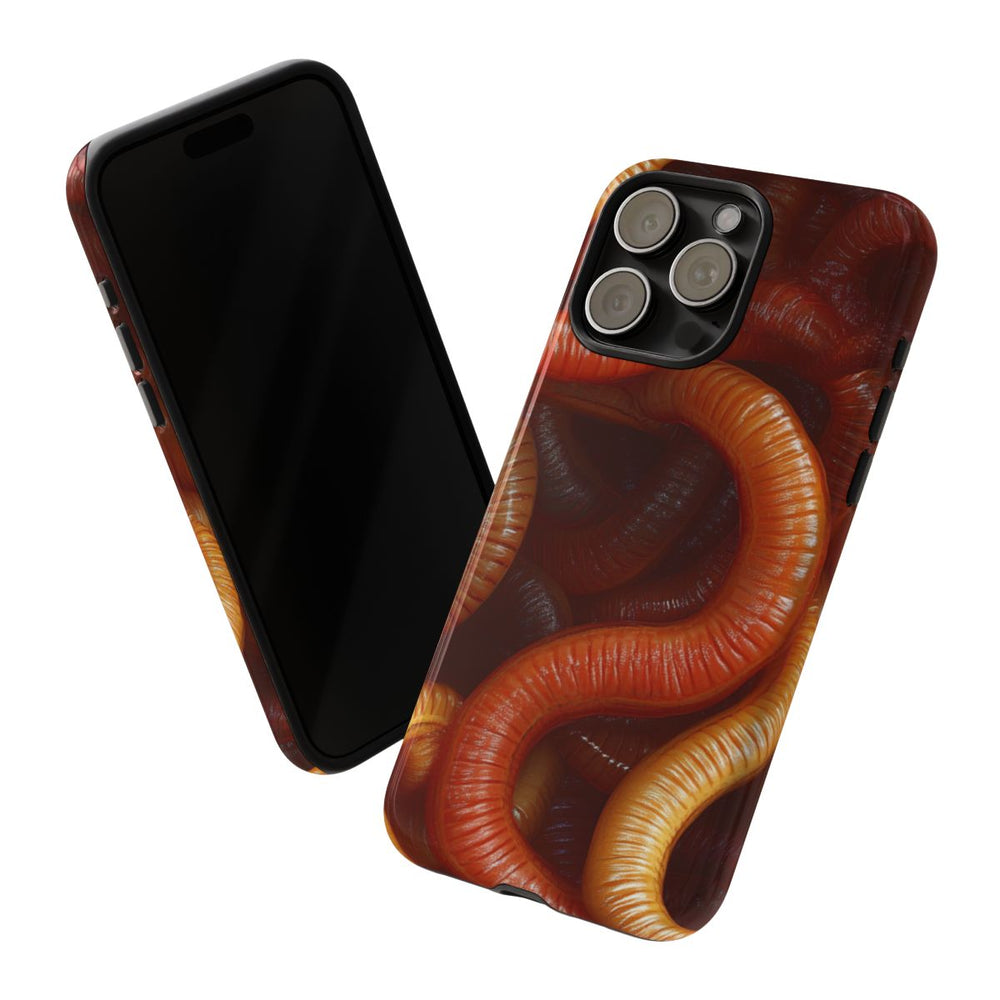 Dit hoesje heeft een fotorealistisch ontwerp met een close-up van talloze verstrengelde aardwormen. De wormen zijn afgebeeld in warme tinten bruin, oranje en geel, met een glanzende, natte uitstraling die hun segmenten benadrukt. Het patroon bedekt het hele oppervlak en zorgt voor een levendig, organisch geheel. Het hoesje is glanzend en extra stevig dankzij de dubbele laag van polycarbonaat en TPU, waardoor het optimale bescherming biedt. Geschikt voor draadloos opladen.