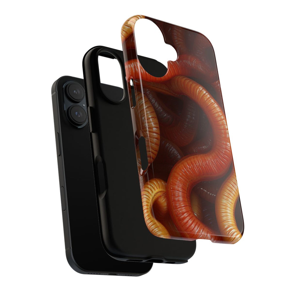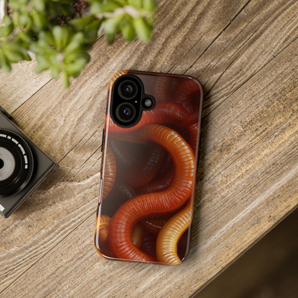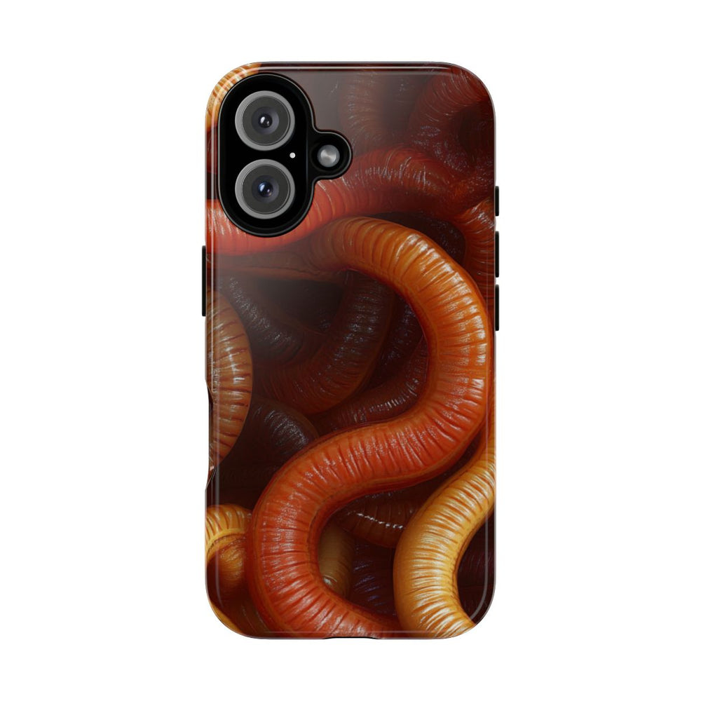 Dit hoesje heeft een fotorealistisch ontwerp met een close-up van talloze verstrengelde aardwormen. De wormen zijn afgebeeld in warme tinten bruin, oranje en geel, met een glanzende, natte uitstraling die hun segmenten benadrukt. Het patroon bedekt het hele oppervlak en zorgt voor een levendig, organisch geheel. Het hoesje is glanzend en extra stevig dankzij de dubbele laag van polycarbonaat en TPU, waardoor het optimale bescherming biedt. Geschikt voor draadloos opladen.