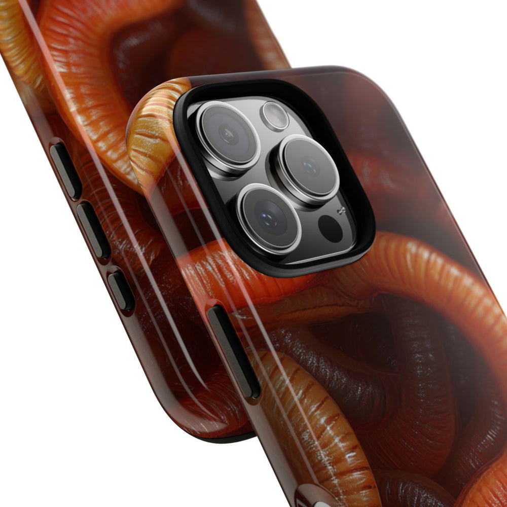Dit hoesje heeft een fotorealistisch ontwerp met een close-up van talloze verstrengelde aardwormen. De wormen zijn afgebeeld in warme tinten bruin, oranje en geel, met een glanzende, natte uitstraling die hun segmenten benadrukt. Het patroon bedekt het hele oppervlak en zorgt voor een levendig, organisch geheel. Het hoesje is glanzend en extra stevig dankzij de dubbele laag van polycarbonaat en TPU, waardoor het optimale bescherming biedt. Geschikt voor draadloos opladen.