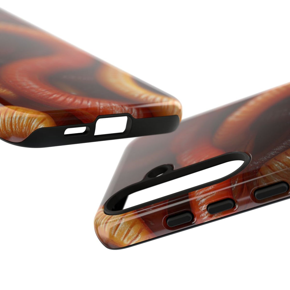 Dit hoesje heeft een fotorealistisch ontwerp met een close-up van talloze verstrengelde aardwormen. De wormen zijn afgebeeld in warme tinten bruin, oranje en geel, met een glanzende, natte uitstraling die hun segmenten benadrukt. Het patroon bedekt het hele oppervlak en zorgt voor een levendig, organisch geheel. Het hoesje is glanzend en extra stevig dankzij de dubbele laag van polycarbonaat en TPU, waardoor het optimale bescherming biedt. Geschikt voor draadloos opladen.