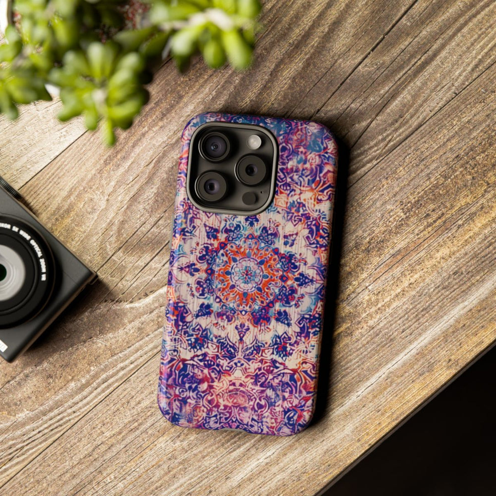 Dit telefoonhoesje is voorzien van een complex en symmetrisch patroon dat doet denken aan een oosters tapijt, maar dan met een psychedelische twist. De afbeelding bestaat uit een levendige mix van diepe blauwtinten, paars, roze, oranje en wit. Het patroon is rijk aan sierlijke bloemmotieven en abstracte vormen die vanuit het midden uitstralen. De print is aangebracht op een glanzend en stevig hoesje van polycarbonaat en TPU, wat zorgt voor een dubbele bescherming en geschikt is voor draadloos opladen. Dit kleurrijke en kunstzinnige ontwerp is perfect voor liefhebbers van verfijnde en opvallende patronen.