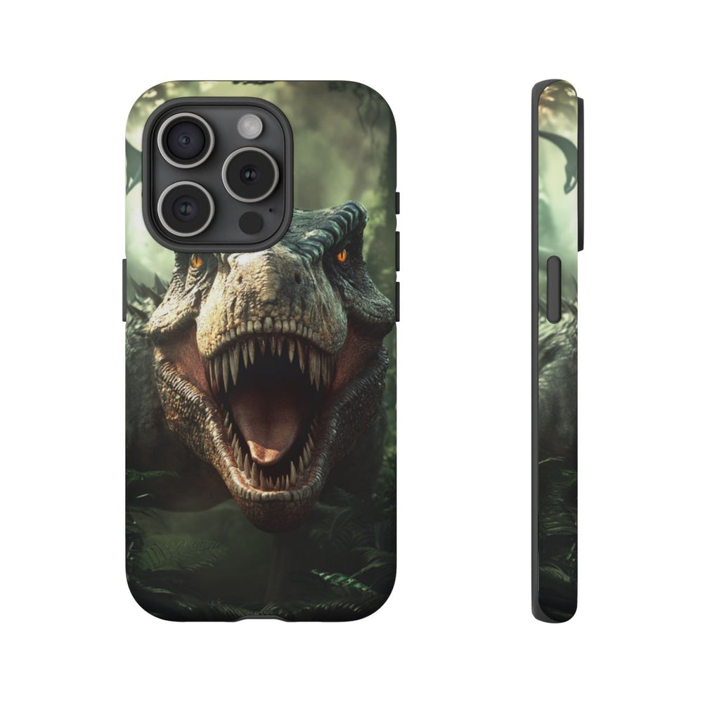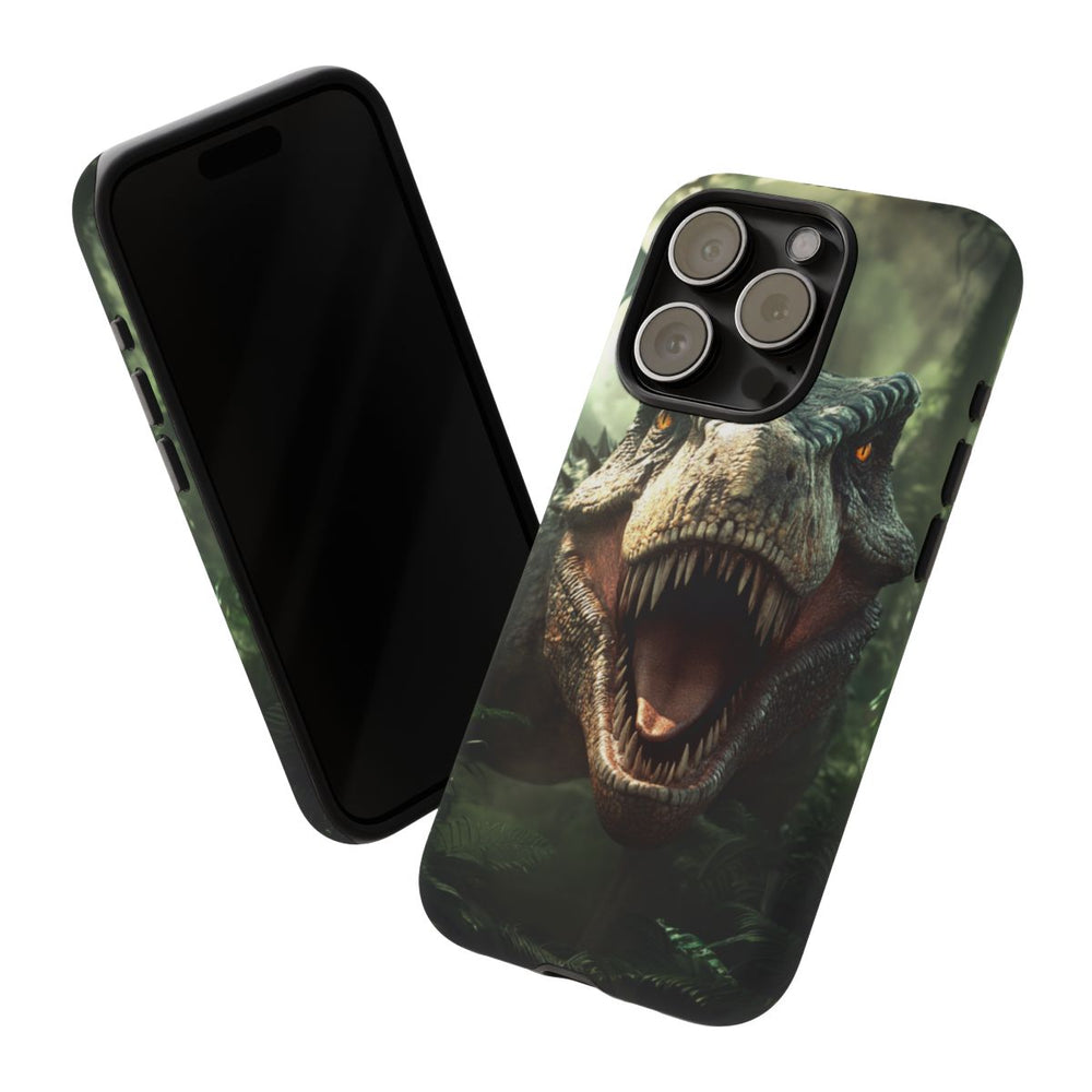 Dit ontwerp toont een zeer gedetailleerde dinosaurus met scherpe tanden en feloranje ogen in een dichtbegroeide jungle. De dinosaurus staat centraal met opengesperde bek, omgeven door weelderig groen en mistig licht dat door de bomen valt. Op de achtergrond is een silhouet van een andere dinosaurus te zien die vliegt of springt. Het hoesje bestaat uit twee lagen van polycarbonaat en TPU voor extra bescherming en ondersteunt draadloos opladen.