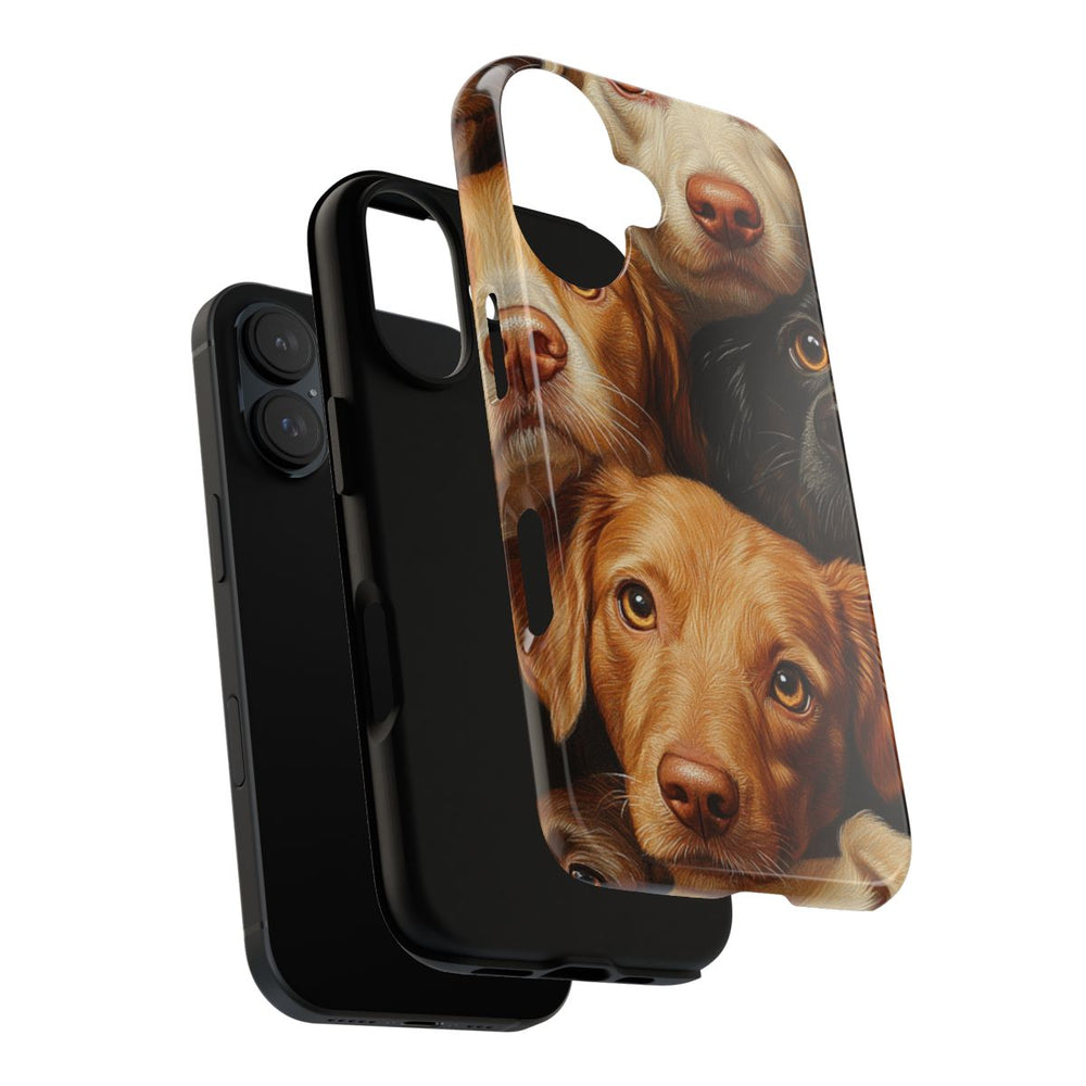Dit hoesje is voorzien van een gedetailleerde illustratie van verschillende hondenkoppen in kleurpotloodstijl. De honden hebben uiteenlopende vachtkleuren zoals zwart, wit, goud, bruin en gestroomd. Elke hond heeft sprekende, ronde ogen en een kenmerkende neus, wat zorgt voor een levensechte en charmante uitstraling. De koppen zijn dicht op elkaar geplaatst, waardoor er geen achtergrond zichtbaar is en de fijne vachtstructuren en warme tinten extra opvallen. Het hoesje heeft een glanzende afwerking, bestaat uit twee beschermende lagen en is geschikt voor draadloos opladen.