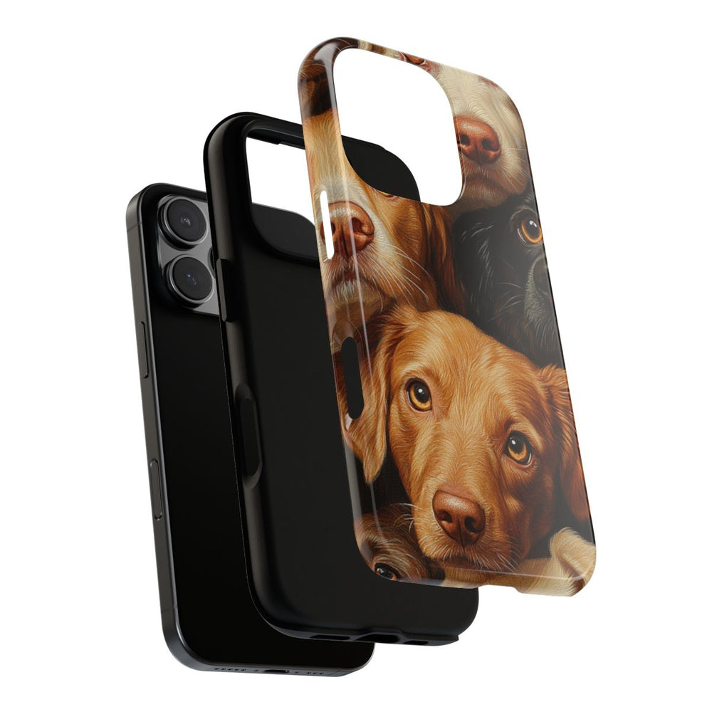Dit hoesje is voorzien van een gedetailleerde illustratie van verschillende hondenkoppen in kleurpotloodstijl. De honden hebben uiteenlopende vachtkleuren zoals zwart, wit, goud, bruin en gestroomd. Elke hond heeft sprekende, ronde ogen en een kenmerkende neus, wat zorgt voor een levensechte en charmante uitstraling. De koppen zijn dicht op elkaar geplaatst, waardoor er geen achtergrond zichtbaar is en de fijne vachtstructuren en warme tinten extra opvallen. Het hoesje heeft een glanzende afwerking, bestaat uit twee beschermende lagen en is geschikt voor draadloos opladen.
