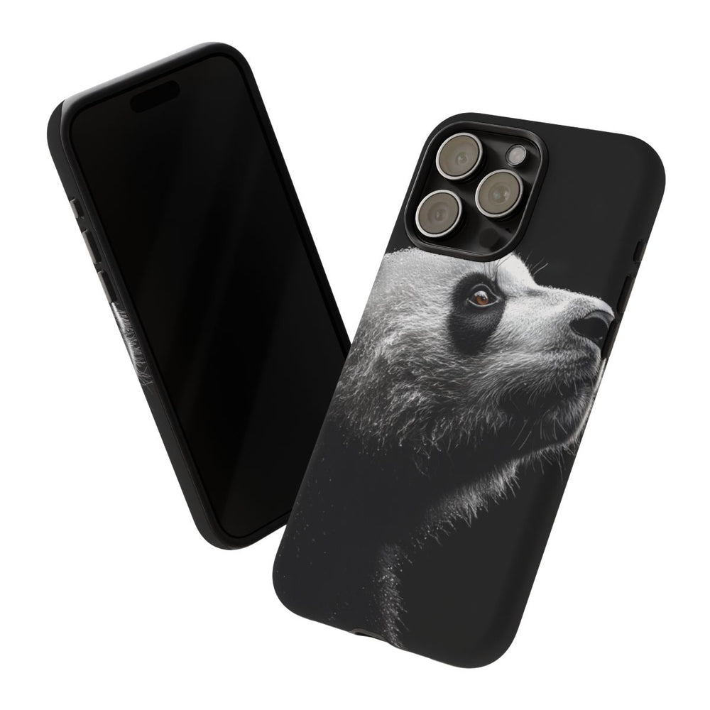 Dit ontwerp toont een gedetailleerd zijaanzicht van het hoofd van een panda op een effen zwarte achtergrond. De textuur van de vacht is realistisch weergegeven met zichtbare waterdruppels, wat een levensecht effect geeft. Het bruine oog valt extra op en vormt een krachtig contrast met de zwart-witte vacht. De afbeelding is bedrukt op een mat telefoonhoesje van stevig polycarbonaat en TPU, dat bestaat uit twee lagen voor optimale bescherming en geschikt is voor draadloos opladen. Het geheel oogt stijlvol en strak, met een subtiel vleugje natuurlijke kleur in het oog.
