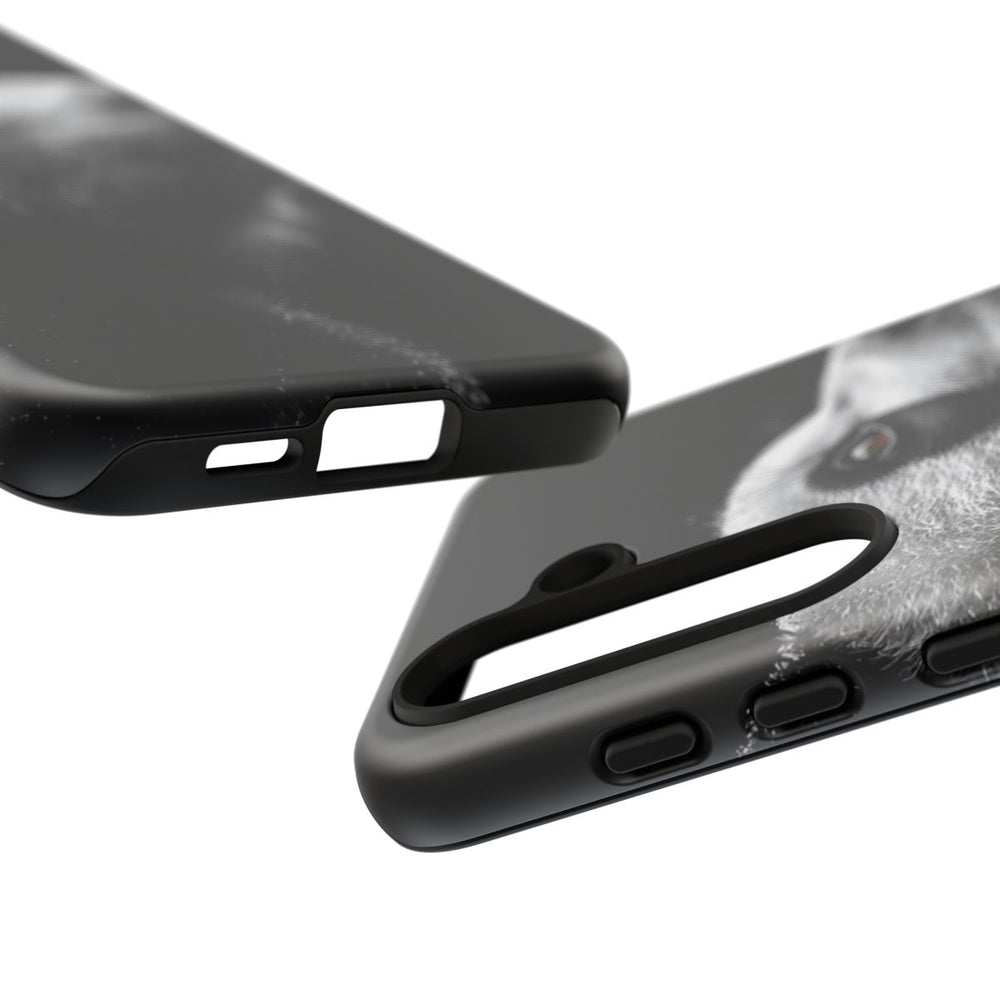 Dit ontwerp toont een gedetailleerd zijaanzicht van het hoofd van een panda op een effen zwarte achtergrond. De textuur van de vacht is realistisch weergegeven met zichtbare waterdruppels, wat een levensecht effect geeft. Het bruine oog valt extra op en vormt een krachtig contrast met de zwart-witte vacht. De afbeelding is bedrukt op een mat telefoonhoesje van stevig polycarbonaat en TPU, dat bestaat uit twee lagen voor optimale bescherming en geschikt is voor draadloos opladen. Het geheel oogt stijlvol en strak, met een subtiel vleugje natuurlijke kleur in het oog.
