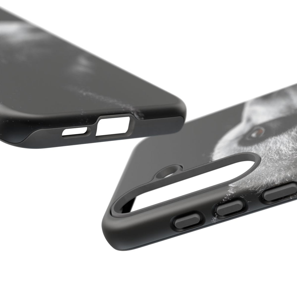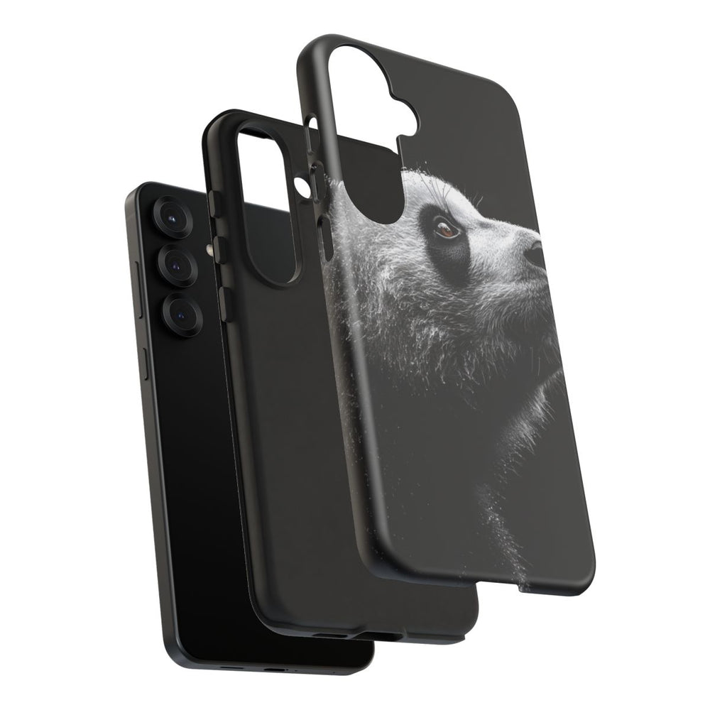 Dit ontwerp toont een gedetailleerd zijaanzicht van het hoofd van een panda op een effen zwarte achtergrond. De textuur van de vacht is realistisch weergegeven met zichtbare waterdruppels, wat een levensecht effect geeft. Het bruine oog valt extra op en vormt een krachtig contrast met de zwart-witte vacht. De afbeelding is bedrukt op een mat telefoonhoesje van stevig polycarbonaat en TPU, dat bestaat uit twee lagen voor optimale bescherming en geschikt is voor draadloos opladen. Het geheel oogt stijlvol en strak, met een subtiel vleugje natuurlijke kleur in het oog.