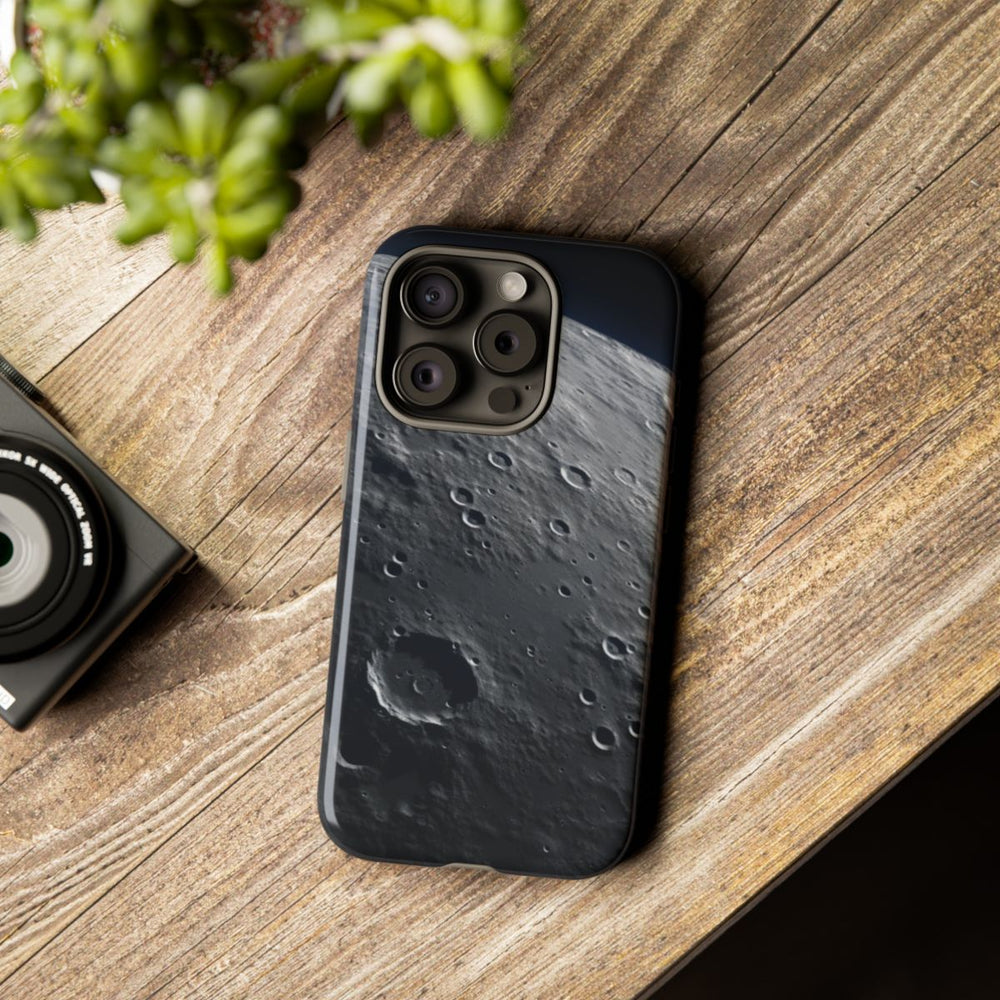 Dit hoesje heeft een gedetailleerde afbeelding van een maanoppervlak vol kraters, met een levensechte textuur. Op het ontwerp zijn talloze inslagkraters in verschillende formaten te zien, verspreid over het grijze, rotsachtige maanlandschap en omlijst door een donkere ruimte-achtergrond. Schaduwen benadrukken de diepte van de kraters en geven het geheel een realistische uitstraling. Het ontwerp is gedrukt op een glanzend, stevig hoesje van polycarbonaat en TPU, dat bestaat uit twee lagen voor extra bescherming en geschikt is voor draadloos opladen.