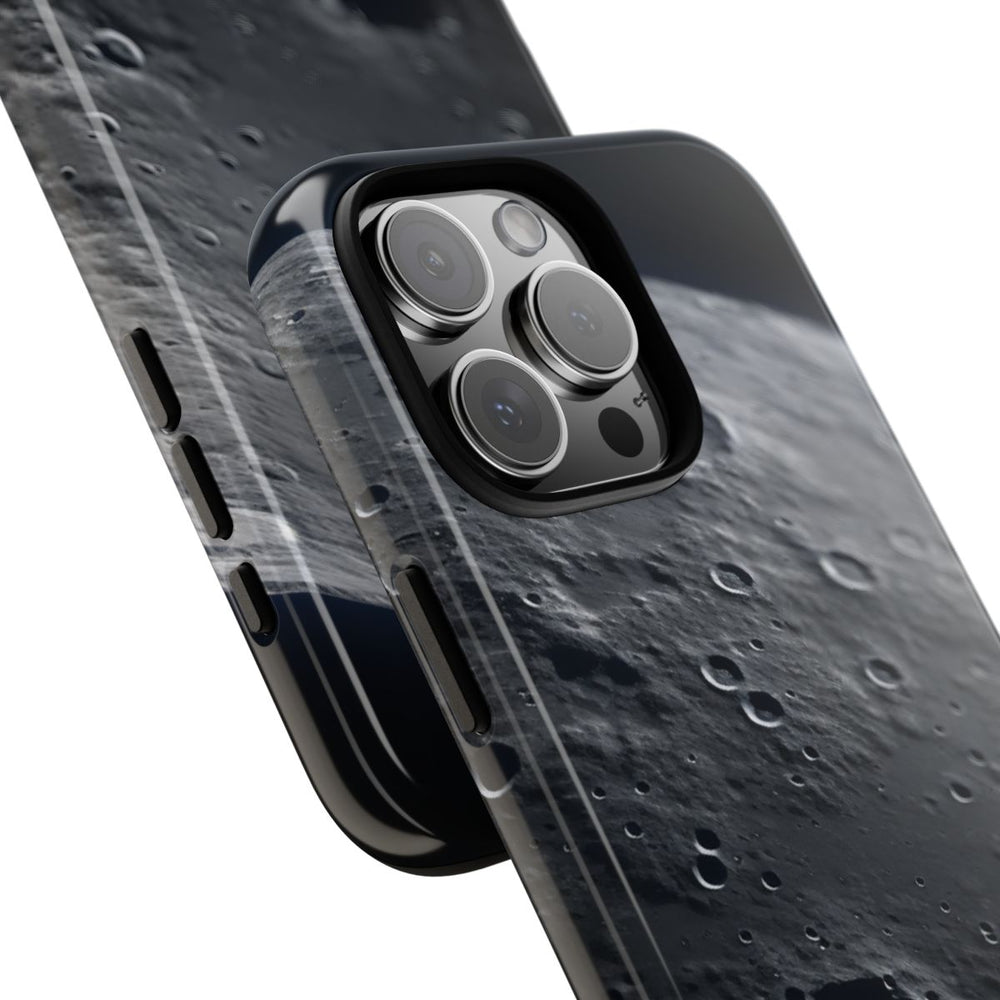Dit hoesje heeft een gedetailleerde afbeelding van een maanoppervlak vol kraters, met een levensechte textuur. Op het ontwerp zijn talloze inslagkraters in verschillende formaten te zien, verspreid over het grijze, rotsachtige maanlandschap en omlijst door een donkere ruimte-achtergrond. Schaduwen benadrukken de diepte van de kraters en geven het geheel een realistische uitstraling. Het ontwerp is gedrukt op een glanzend, stevig hoesje van polycarbonaat en TPU, dat bestaat uit twee lagen voor extra bescherming en geschikt is voor draadloos opladen.