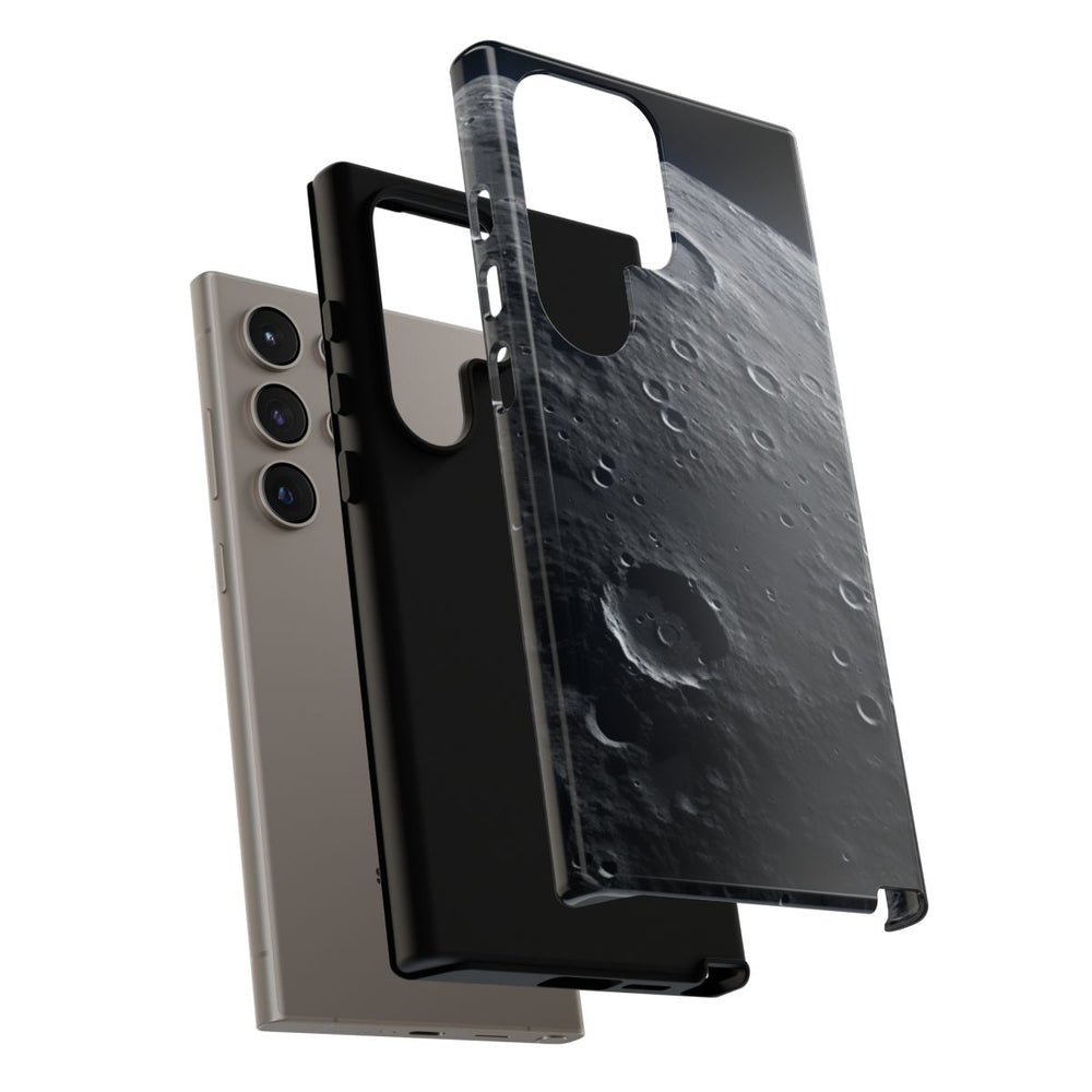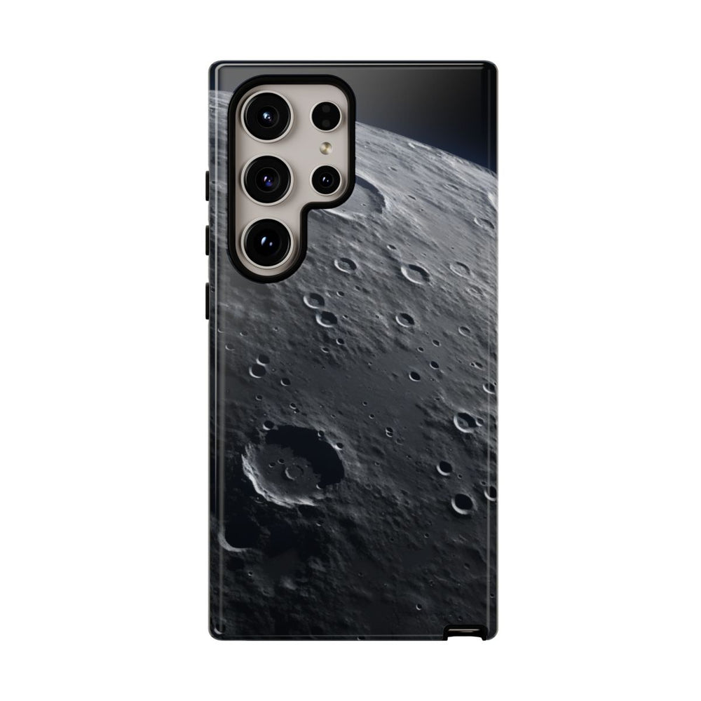Dit hoesje heeft een gedetailleerde afbeelding van een maanoppervlak vol kraters, met een levensechte textuur. Op het ontwerp zijn talloze inslagkraters in verschillende formaten te zien, verspreid over het grijze, rotsachtige maanlandschap en omlijst door een donkere ruimte-achtergrond. Schaduwen benadrukken de diepte van de kraters en geven het geheel een realistische uitstraling. Het ontwerp is gedrukt op een glanzend, stevig hoesje van polycarbonaat en TPU, dat bestaat uit twee lagen voor extra bescherming en geschikt is voor draadloos opladen.