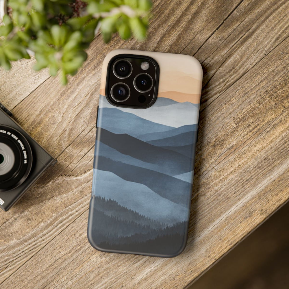 Dit hoesje toont een rustgevend berglandschap met meerdere bergkammen die in de verte vervagen. De bergen zijn afgebeeld in verschillende blauwtinten, die richting de horizon overgaan in beige. Op de voorgrond zijn gedetailleerde silhouetten van dennenbomen zichtbaar, wat extra diepte en structuur geeft. De stijl is zacht en sfeervol, waardoor een kalme en natuurlijke uitstraling ontstaat. Het hoesje bestaat uit twee stevige lagen van polycarbonaat en TPU, en is ontworpen voor duurzaamheid en bescherming bij buitengebruik.