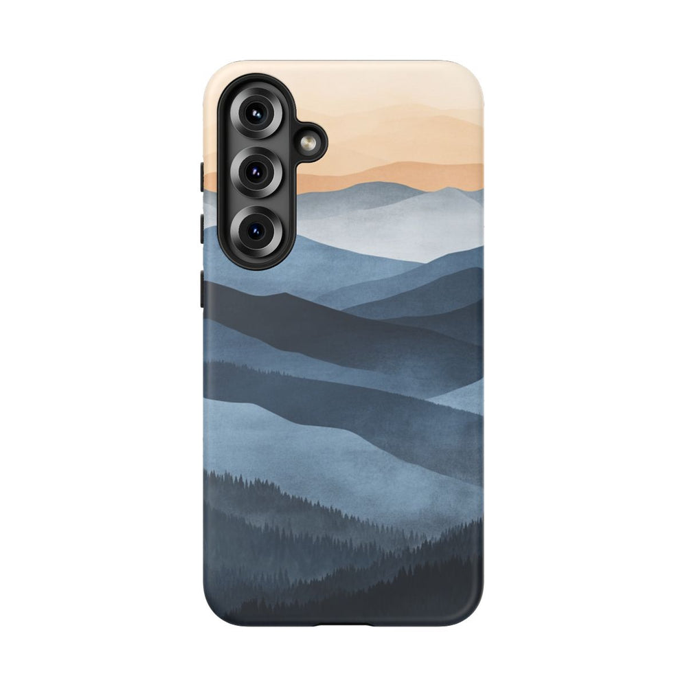 Dit hoesje toont een rustgevend berglandschap met meerdere bergkammen die in de verte vervagen. De bergen zijn afgebeeld in verschillende blauwtinten, die richting de horizon overgaan in beige. Op de voorgrond zijn gedetailleerde silhouetten van dennenbomen zichtbaar, wat extra diepte en structuur geeft. De stijl is zacht en sfeervol, waardoor een kalme en natuurlijke uitstraling ontstaat. Het hoesje bestaat uit twee stevige lagen van polycarbonaat en TPU, en is ontworpen voor duurzaamheid en bescherming bij buitengebruik.