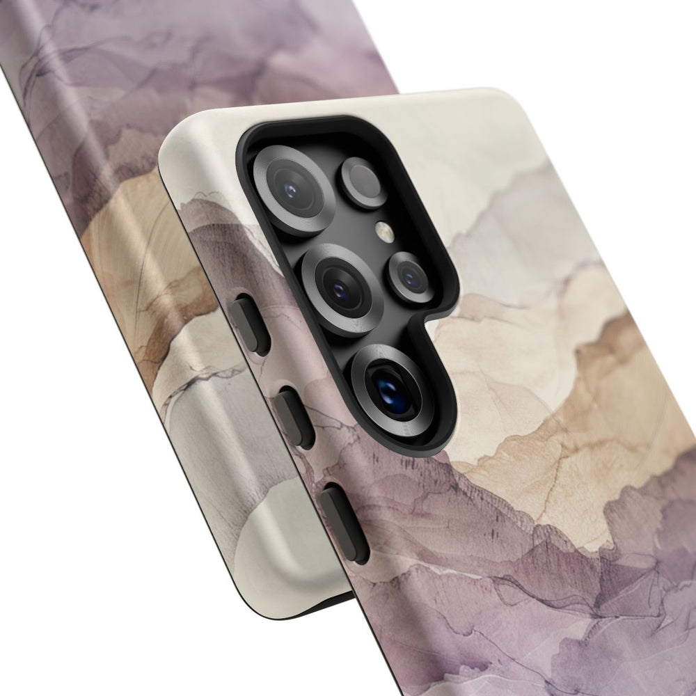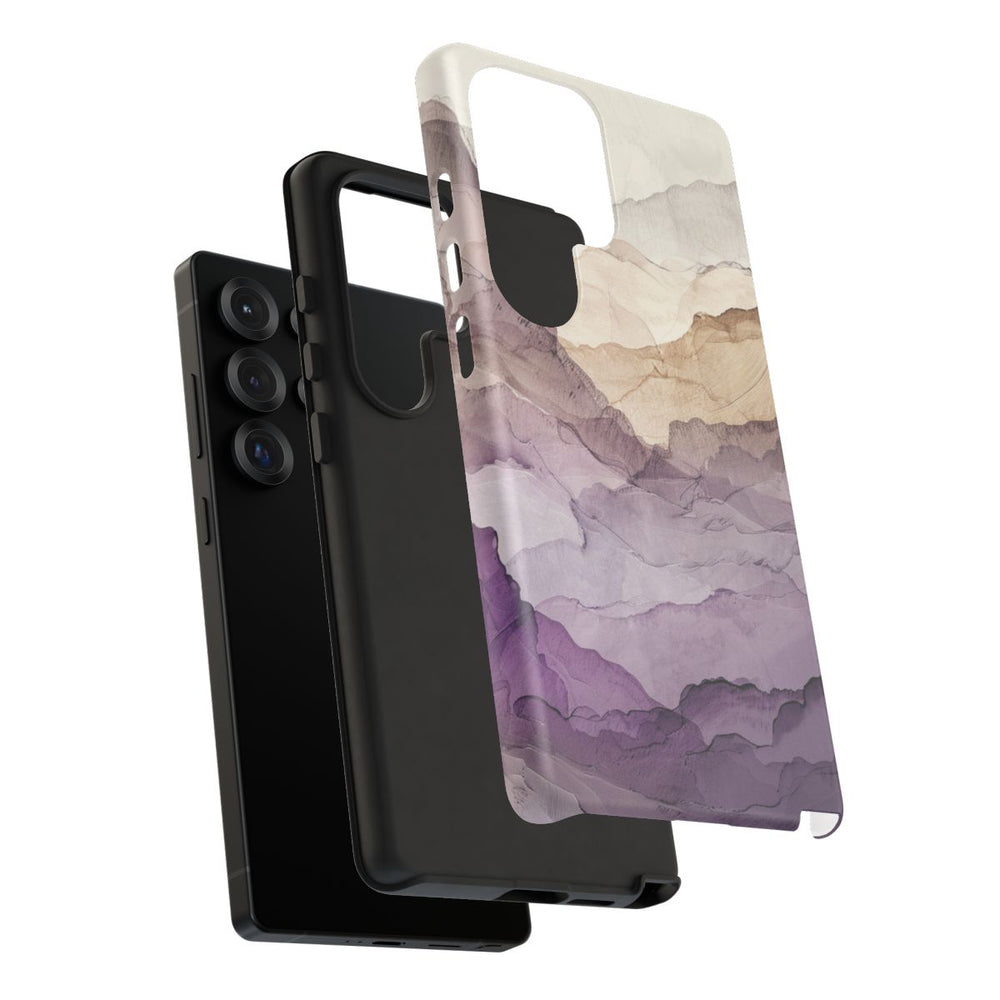 Dit telefoonhoesje toont een abstract landschap met overlappende lagen die doen denken aan gesteenteformaties. Het ontwerp gebruikt zachte, gedempte tinten paars, beige en grijs voor een rustige, minimalistische uitstraling. De lagen hebben een doorschijnende, aquarelachtige textuur met fijne lijnen voor extra diepte en detail. De lichte achtergrond laat de vormen mooi uitkomen. Het ontwerp is gedrukt op een stevig mat hoesje van polycarbonaat met een TPU-voering, dat uitstekende bescherming biedt en draadloos opladen ondersteunt.
