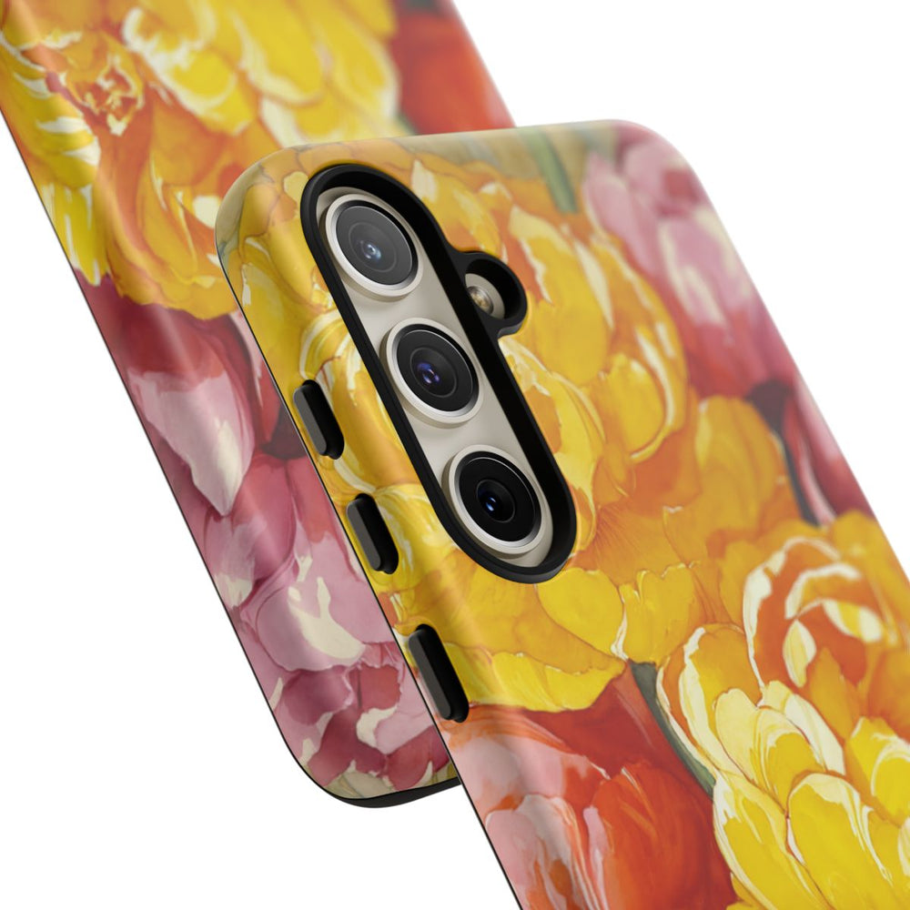 Dit telefoonhoesje is voorzien van een waterverfdesign met grote pioenen in levendige gele, roze en oranje tinten. De bloemen zijn gedetailleerd uitgewerkt met zachte schaduwen en lichte accenten, en worden omringd door groene bladeren op een subtiele, golvende achtergrond. Het ontwerp is gedrukt op een stevige, matte hoes met dubbele laag van polycarbonaat en TPU, waardoor optimale bescherming en duurzaamheid worden geboden. Geschikt voor draadloos opladen. Niet compatibel met MagSafe.