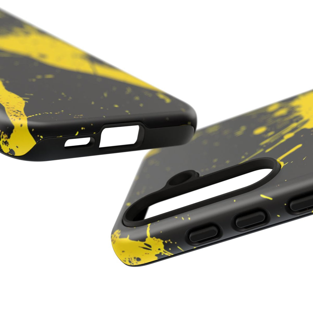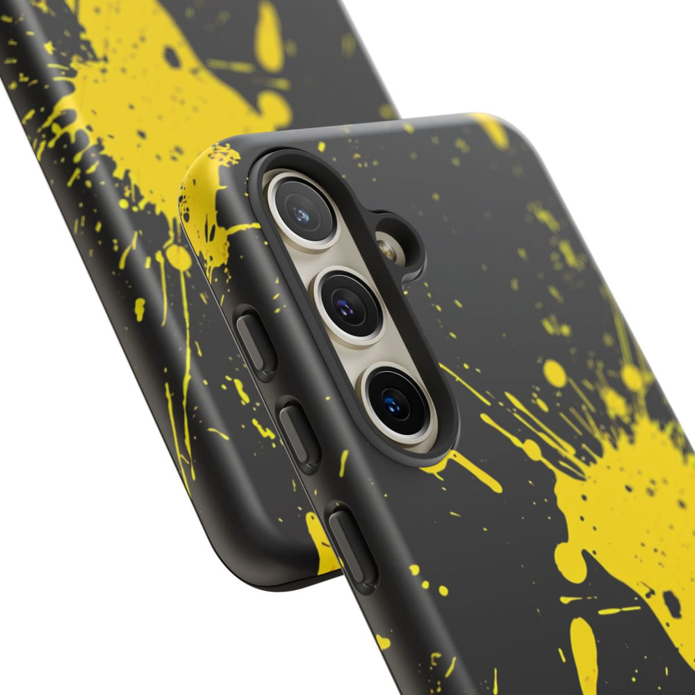 Dit telefoonhoesje heeft een opvallend ontwerp met heldergele verfspatten op een effen zwarte achtergrond. De spatten verschillen in grootte en vorm, wat zorgt voor een levendig en dynamisch abstract patroon. Het hoesje heeft een matte afwerking en bestaat uit twee lagen: een stevige polycarbonaat buitenkant en een TPU binnenkant voor extra bescherming en duurzaamheid. Geschikt voor draadloos opladen en bestand tegen weersinvloeden, terwijl de optische kwaliteit langdurig behouden blijft.